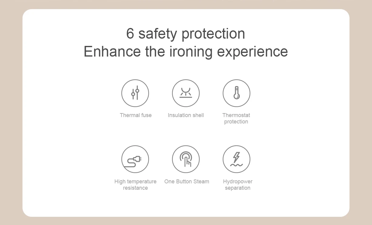 6 защита безопасностиУвеличьте опыт глажкиТепловой предохранительЗащита предохранителяИзоляционный корпусЗащита поверхности от температурыЗащита термостатаВысокая термостойкостьРезиновый шнур питанияПара с одной кнопкой3 секунды пуск и остановка *Разделение гидроэнергии