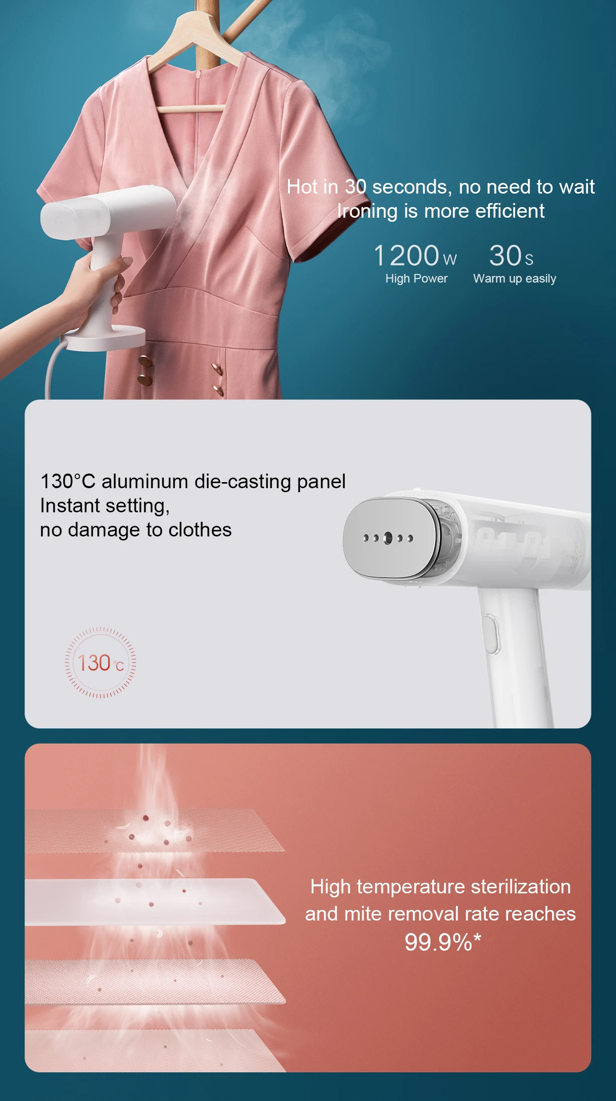 Горячая в течение 30 секунд, не нужно ждатьЭффективность глажкиВысокая мощность 1200 вт, быстрое подогрев уменьшает ожидание, во время глажки быстро, избегая повреждения одежды, вызванные высокой температурой, изменение формы аккуратных линий в течение 30 секунд.130 ° C алюминиевая литьевая панельМгновенная настройка, не повреждает одеждуС помощью алюминиевой панели литья под давлением 130 ° C высокотемпературный пар повторно испаряется и температура прочно заблокирована, сухая глажка без капель, мгновенное формирование. Керамическое глазурное покрытие, которое идеально сочетается с одеждой и гладко утягивает одежду.Высокая температура стерилизации и скорость удаления клещей достигает 99.9%Защищать чистоту всей семьиПри множественном воздействии пара под давлением и высокотемпературной панели, он может гарантировать, что высокая температура смягчает волокна одежды снаружи, эффективно удаляя бактерии и клещи, И обеспечения чистоты и здоровья одежды.