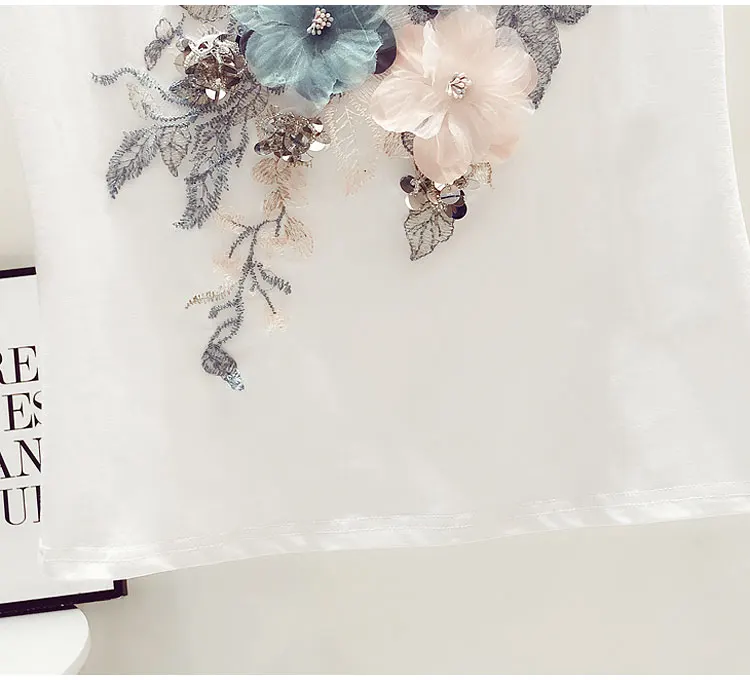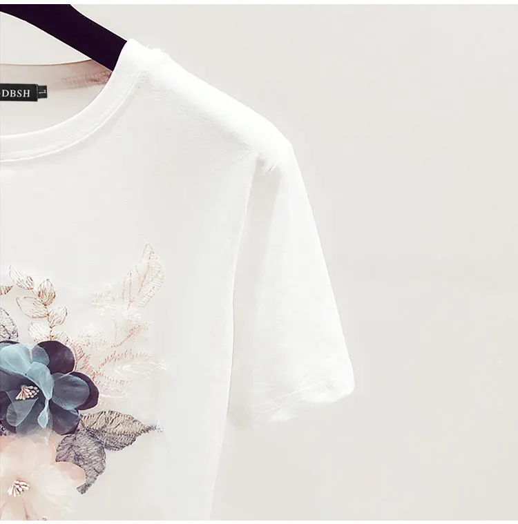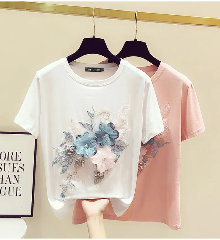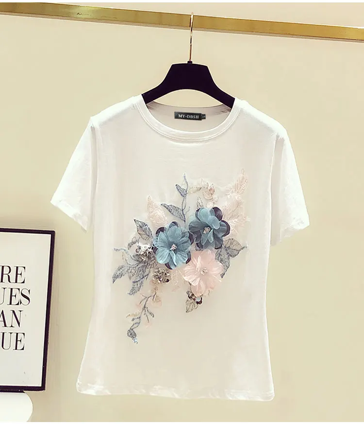 Женская футболка с цветами с вышивкой и бисером, топ с круглым вырезом и коротким рукавом для девушек, Цветочная футболка, лето 2021