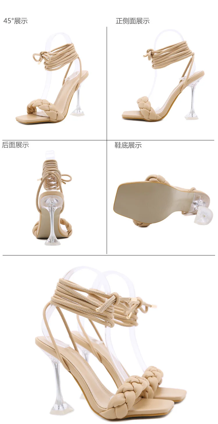 Fujinженские босоножки; Обувь с открытым носком; Новинка 2021 года; Сезон лето; Модный дизайн; Плетеные женские босоножки; Прозрачные и необычные туфли на высоком каблуке