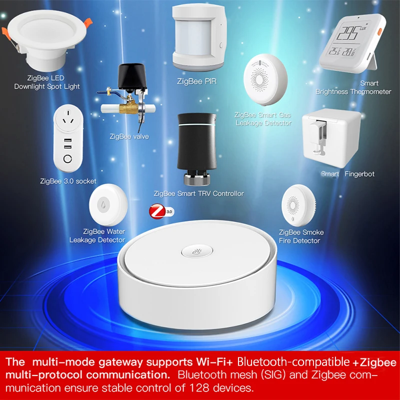 Многорежимный шлюз поддерживает связь по протоколам Wi-Fi + Bluetooth + ZigbeeСовместимая с Bluetooth сетка (SIG) и связь Zigbee обеспечивают стабильное управление 128 устройствами