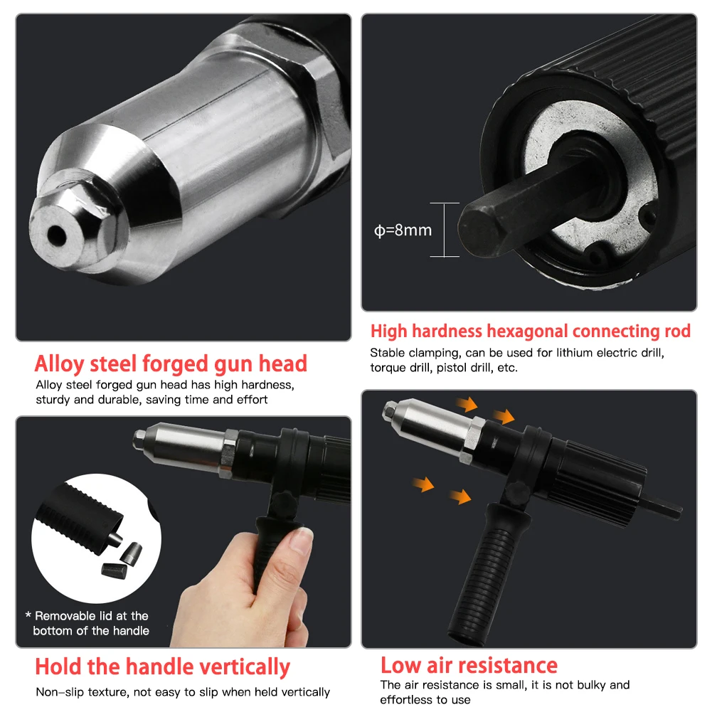 1. Более прочный: Этот электрический пистолет с заклепками полностью изготовлен из металла и обладает высокой рабочей прочностью. Кованая головка из легированной стали имеет высокую твердость и долговечность, экономя время и усилия.