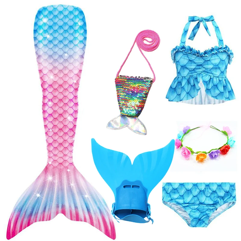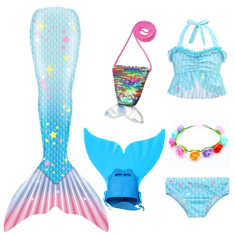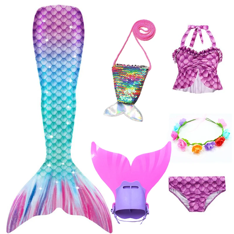 6 шт.: 1 * юбка с хвостом русалки + 1 * бюстгальтер + 1 * шорты + 1 * плавник монофин + 1 * венок + 1 * сумка русалки