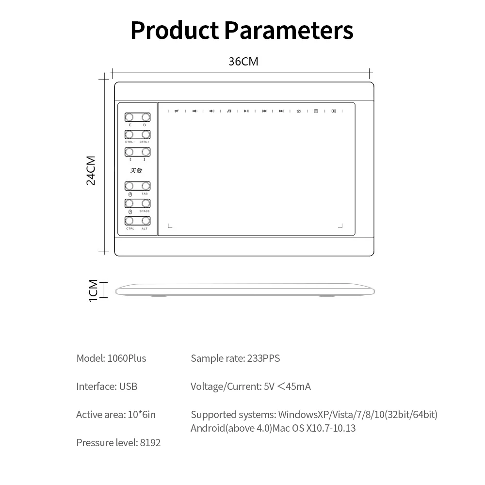Особенности:Высокая производительностьВысокое разрешение и быстрый отклик, частота отчетов 230PPS и разрешение 5080LPI обеспечивают более быстрое распознавание и лучший эффект отображения во время создания.8192 уровень чувствительности к давлениюПассивная технология, профессиональный уровень давления, линии толстые и тонкие, картины деликатные, гладкие и естественные.Ключевая функция12 физических клавиш и 10 мультимедийных клавиш, можно настроить и предоставить вам множество способов адаптации вашего программного обеспечения и повышения эффективности вашей работы.Большая доскаБольшая площадь для рисования доски 10*6 дюймов с эксклюзивной зоной рисования телефона.Широкая совместимостьПоддержка подключения к нескольким устройствам: телефону/планшету/ноутбуку/настольному компьютеру; Совместимость с несколькими системами:Windows/Mac OS X/Android, подходит для различных программ для рисования телефонов.Спецификация:Бренд: 10 ЛунНазвание продукта: графический планшетМодель: 1060PlusЦвет: черныйАктивная область: 10*6 дюймовУровень давления: 8192Частота выборки: 233PPSРазрешение экрана: 5080LPIАктивная высота: 15 ммВес ручки: <9,5 гИнтерфейс: USBРабочий ток: <45 мАРабочая температура: -5 ~ 40 ℃Температура хранения: -20 ~ 60 ℃Операционная система: Windows XP/7/8/8/1/10(32 бит/64 бит)Размер изделия: 36*24*1,3 см/14,17*9,45*0,51 дюйма (Д * Ш * В)Вес изделия: прибл. 669 г/23,6 унцииПосылка: 39,3*28,3*4,8 см/15,47*11,14*1,89 дюйма (Д * Ш * В)Вес посылка: 993 г/35,03 унцииУпаковочный лист:Планшет 1*1060Plus1 * ручка для измерения давления8 * перьев1 * зажим для пера1 * бумажная пленка1 * Руководство пользователя