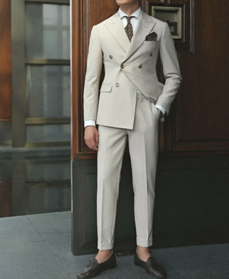 Костюм мужской двубортный, блейзер с лацканами, пиджак и брюки, строгий офисный костюм, бежевый костюм, 2 предмета