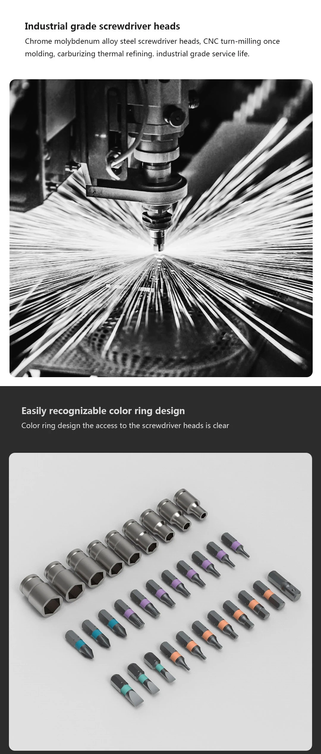 * Легко узнаваемый дизайн цветного кольца, доступ к головкам отвертки чистый