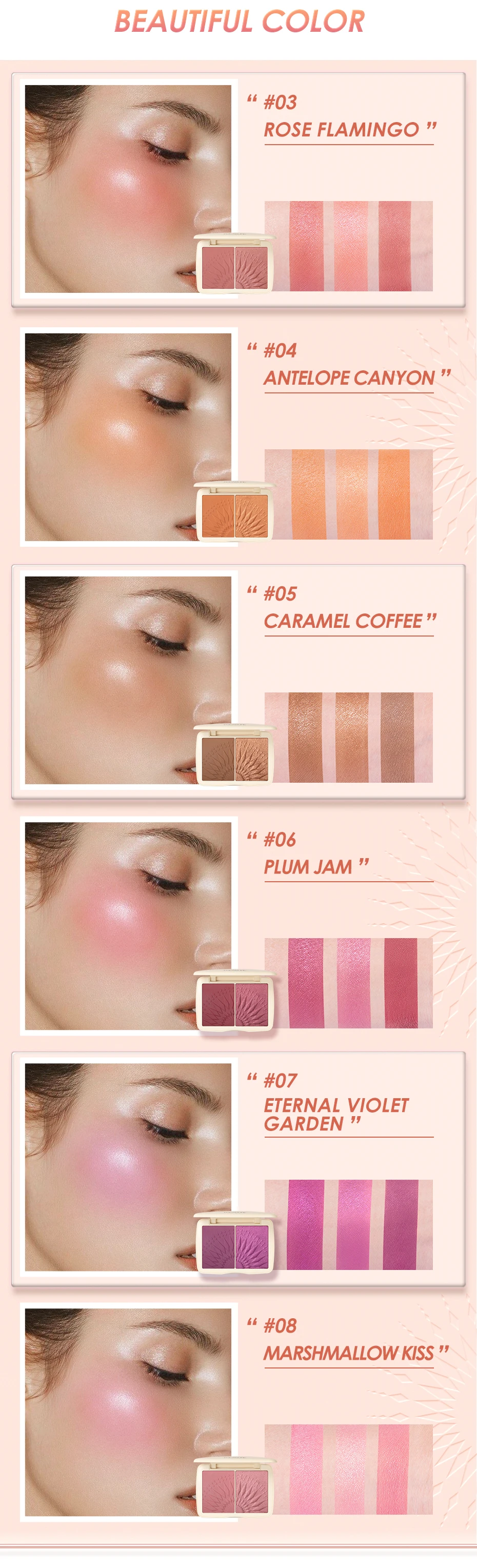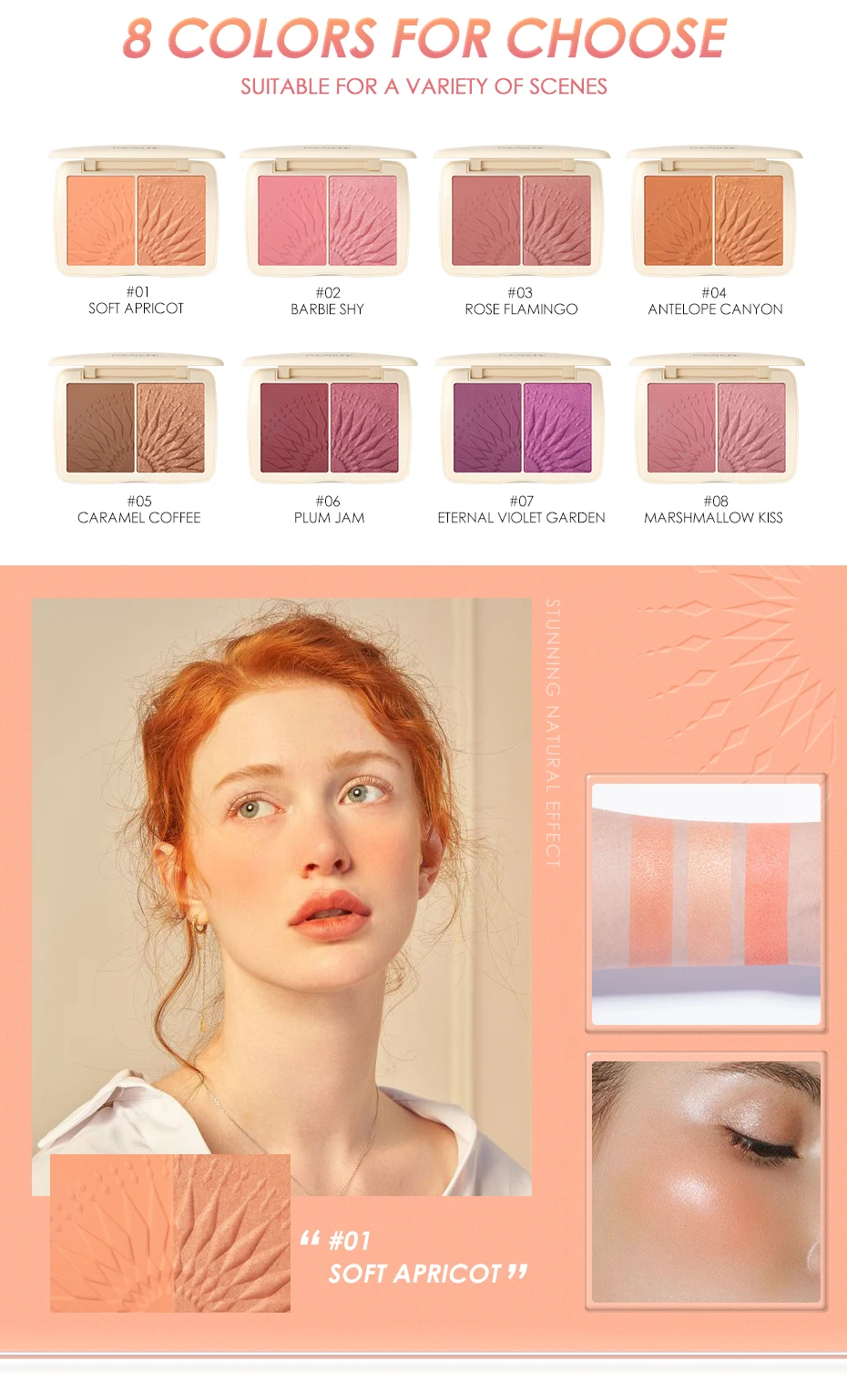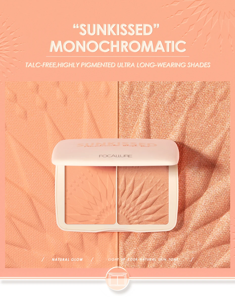 FOCALLURE MONOCHROMATIC DUO-это уникальное воплощение сияющего солнца, отличающееся матовыми и мерцающими оттенками для стереоскопической отделки. Шелковистые, сверхтонкие Порошковые пигменты в матовых и мерцающих оттенках обеспечивают бесшовное нанесение. Эта палитра предоставляет вам преобладающий цвет и мягкий цвет, чтобы вы могли использовать их в любое время и в любом месте. Она очень пигментирована, роскошная, без Халка и талька. Он идеально подходит для всех тех, кто не хочет носить отдельные продукты, потому что он дружелюбен к путешествиям и имеет несколько применений (румяна, контурный хайлайтер, бронзатор). Долговечный цвет органично сочетается с естественным оттенком кожи для сияющего здорового свечения и повышения естественного цвета вашей кожи.Восемь оттенков:#01 мягкий абрикосовый (абрикосовый телесный)#02 Барби застенчивый (детский розовый)#03 розовый Фламинго (пыльный кедр)#04 антилоп Каньон (закат оранжевый)#05 карамельный кофе (карамельный кофе) -- "бронзатор"Сливовый джем #06 (крутая фуксия)Вечный Фиолетовый Сад #07 (фиолетовый Орхидея)#08 болотный поцелуй (пыльная роза)Особенности:Две отделки с монохроматическим матовым (прессованным порошком) и мерцающим (запеченным порошком) для стереоскопического промывания.Высокопигментные восемь оттенков подходят для всех тонов кожи.Кремовая гладкая, но без талька формула делает кожу легкой и естественной.Нетто WT 0,423 OZ / 12GКак использовать:Мягко коснитесь мерцающего оттенка на матовой поверхности для прозрачного мерцающего свечения. Для розово-щекотливого вида начните с яблок щеки и Смешайте вверх. Используйте вашу любимую кисть для румян.