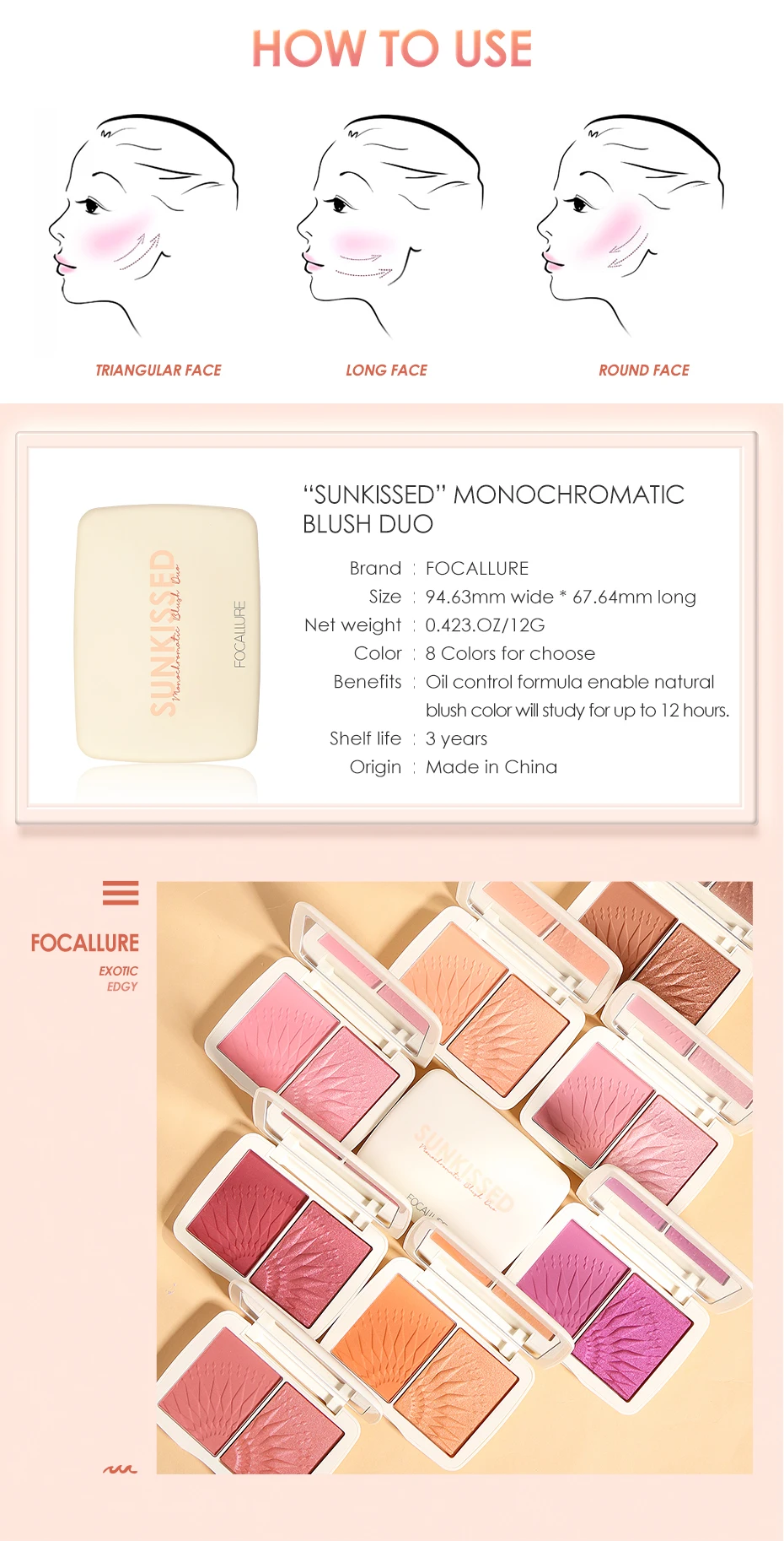FOCALLURE натуральный минеральный пигмент, румяна, пудра для макияжа лица, бронзант, контур, персиковая палитра, розовые румяна