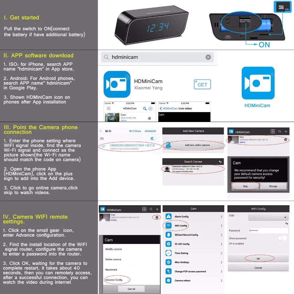 Функция Wi-Fi IP-сетиПоддержка смартфона планшета APP удаленного просмотра и управленияПоддержка просмотра и управления компьютеромПоддержка записи детектива движения Запись аудио и видео в реальном времени Разрешение видео 1080P HDИК ночного виденияПоддержка карт 64GB TF в макс., круговое хранилище Встроенный перезаряжаемый аккумулятор Поддержка записи и зарядки одновременноНон-стоп запись