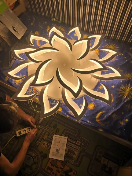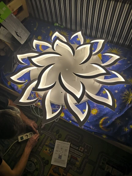 Заказывал люстру 14 лепестков на 24 кв.м.подошла идеально, светит очень ярко. Доставка быстрая до квартиры, упаковано всё надёжно, каждый лепесток отдельно в пупырку. Собирается легко. Пультом регулируется яркость и цвет. Спасибо продавцу.