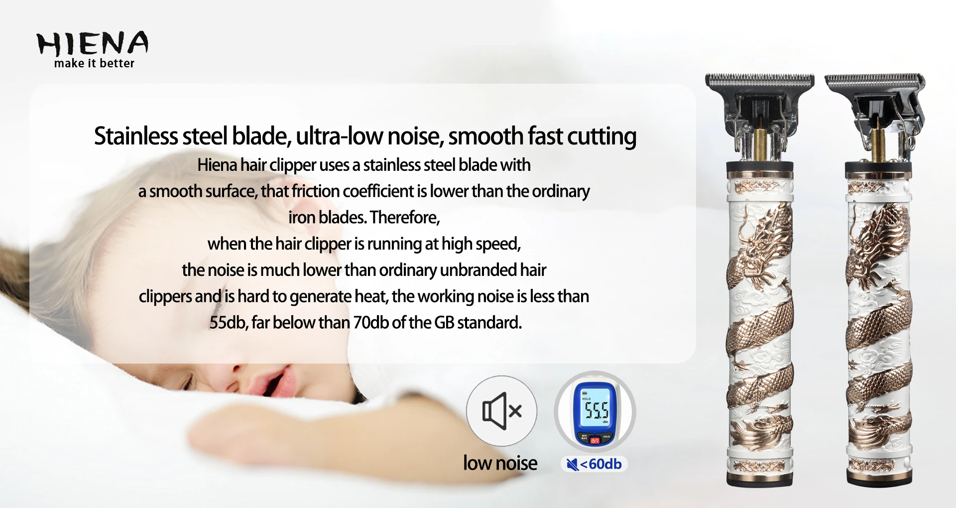 Машинка для стрижки волос Hiena использует лезвие из нержавеющей стали с гладкой поверхностью, что коэффициент трения ниже, чем обычные лезвия железа. Поэтому, когда машинка для стрижки волос работает на высокой скорости, шум намного ниже, чем обычные нефирменные машинки для стрижки волос, и трудно генерировать тепло, рабочий шум менее 5,5 дБ, намного ниже 70 дБ стандарта GB.