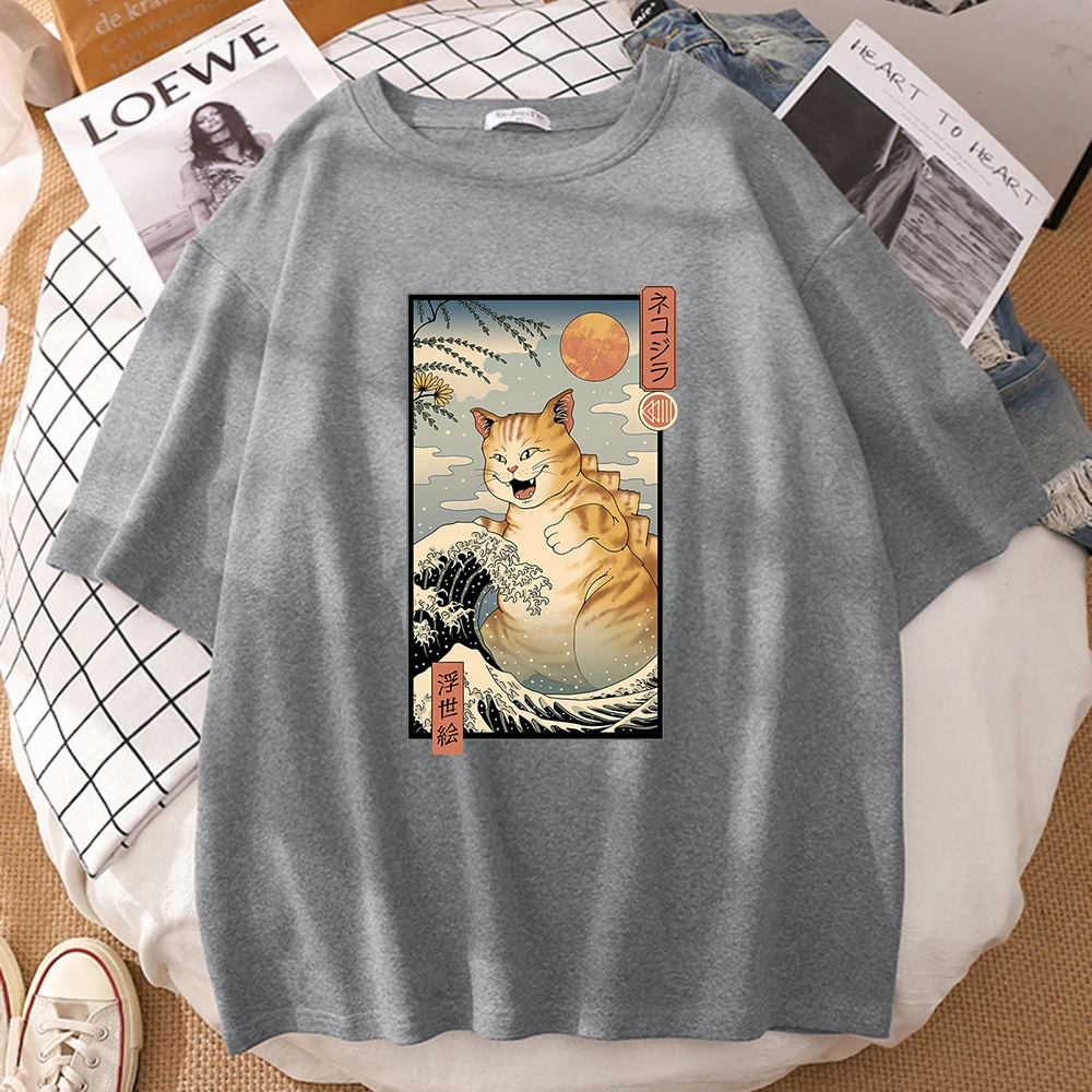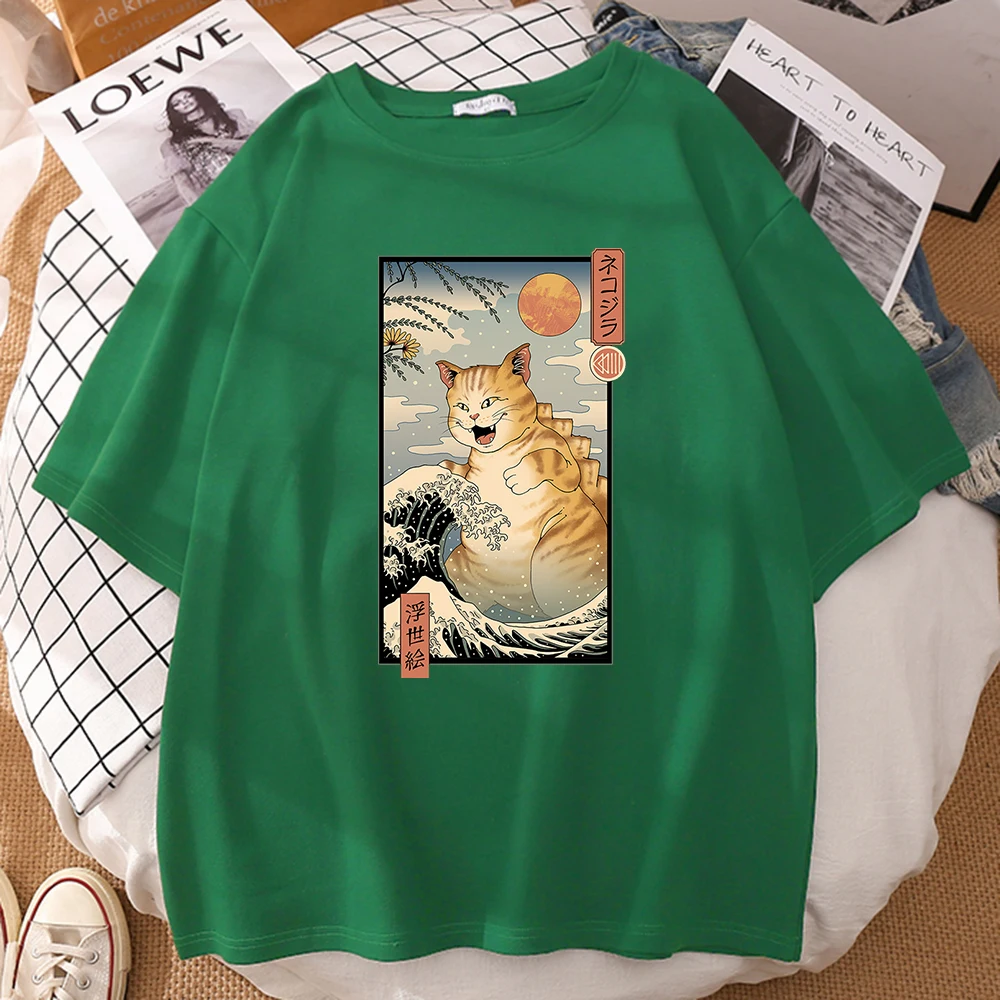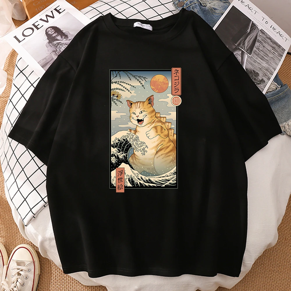 Забавная комиксная женская футболка Neko Raman Ukiyo-E, повседневны...