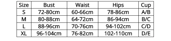 XL чашка: D-E Обхват груди: 96-104 обхват талии: 76-82 обхват бедер: 102-110