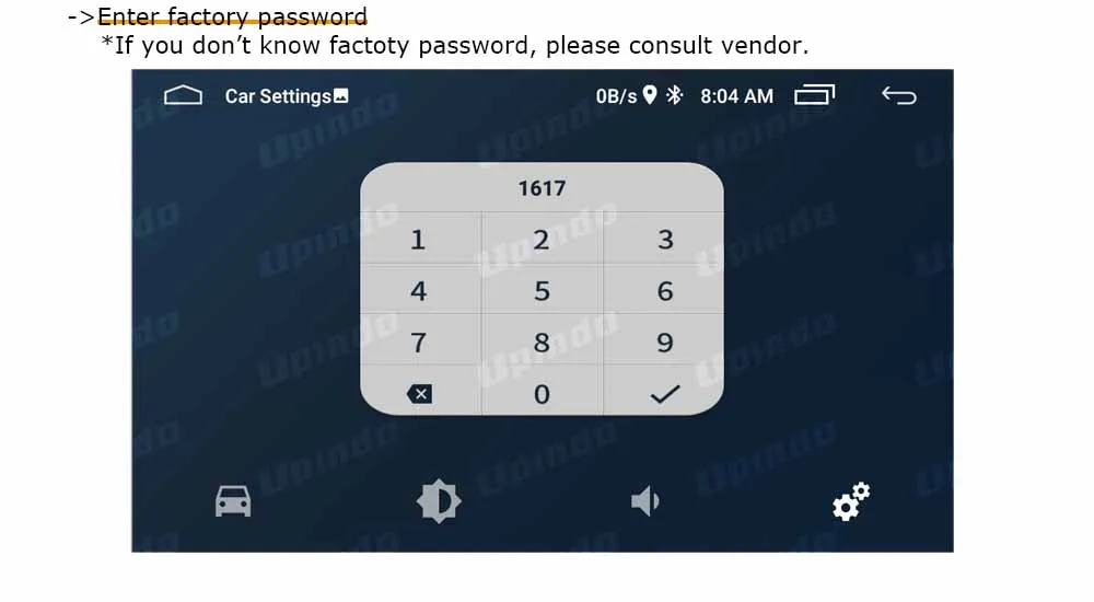-> Введите заводской пароль;Если вы не знаете заводской пароль, пожалуйста, обратитесь к продавцу Радио Android.Мы предоставляем 4 набора паролей: 3368, 1617, 8317, 8888. Если нет 4 наборов паролей, пожалуйста, обратитесь к продавцу Android radio