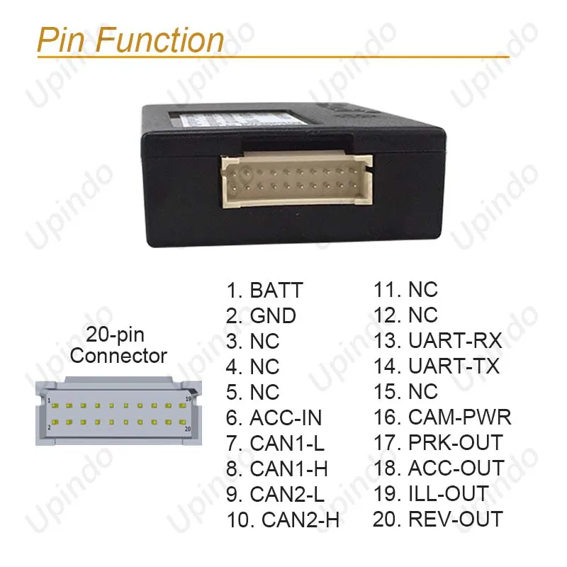 20-контактный разъем проводки:-> Pin 1: Batt (+ 9V ~ 16V)-> Pin 2: Заземление-> Pin 6: ACC-IN (входной сигнал зажигания)-> Pin 7: CAN-> Pin 8: CAN-> Pin 13: URAT-RX. (UART ввод данных)-> Pin 14: URAT-TX (UART вывод данных)-> Pin 16: CAM-PWR (задняя камера + выход 6 В)-> Pin 17: PARK-OUT (выход сигнала парка)-> Pin 18: ACC-OUT (ACC выход сигнала)-> Pin 19: неисправный (светильник с контрольным сигналом на выходе)-> Pin 20: REV-OUT (обратная передача на выходе)-> Pin 3,Pin4,Pin5,Pin9,Pin10,Pin11,Pin12,Pin15: NC (подключение не требуется)
