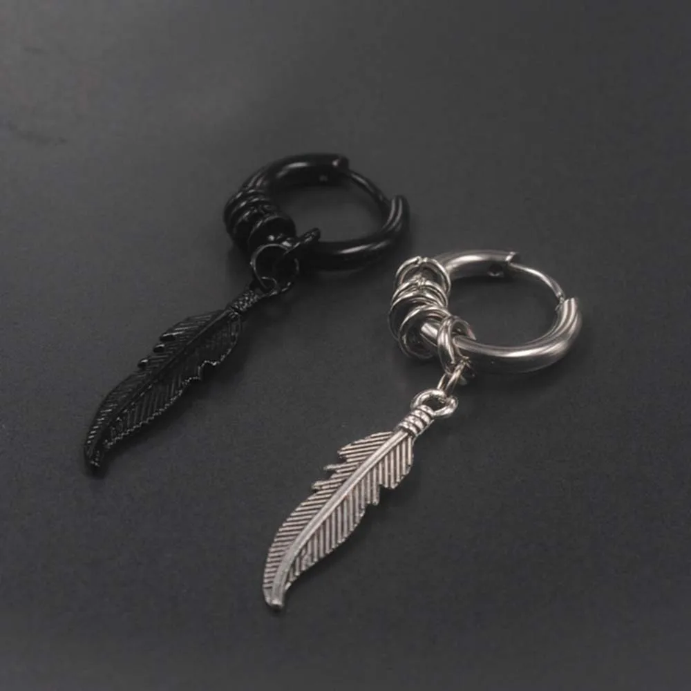 Кулон в виде пера кисточки с маленькими круглыми Хооп Серьги Панк-Рок Хип-хоп Стиль для женщин и мужчин; Унисекс; Туфли из нержавеющей стали, металлические серьги-клипсы драгоценный камень