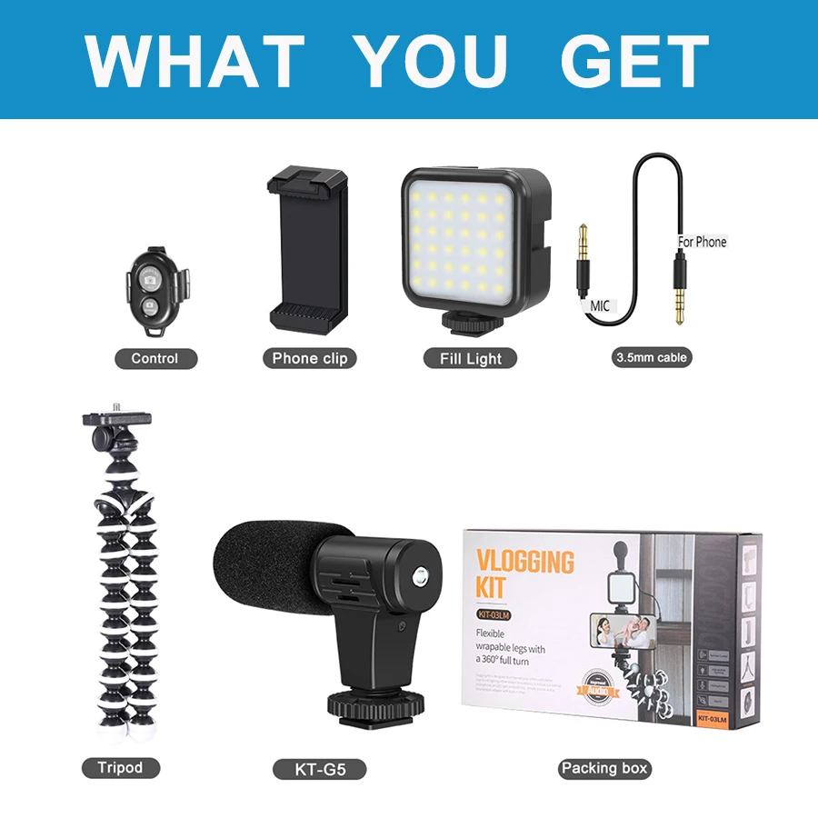 Набор Vlogging предназначен для улучшения ваших видео с лучшим звуком и светильник, работающий как внутри, так и на открытом воздухе, он оснащен универсальным микрофоном для работы на любом смартфоне или камере, светодиодный светильник с 49 супер яркими светодиодами, Рукоятка для штатива, которая может использовать его в качестве штатива для видеосъемки и адаптера смартфона со встроенной обувью, которая позволяет устанавливать не только ваш телефон, но также светильник или микрофон.