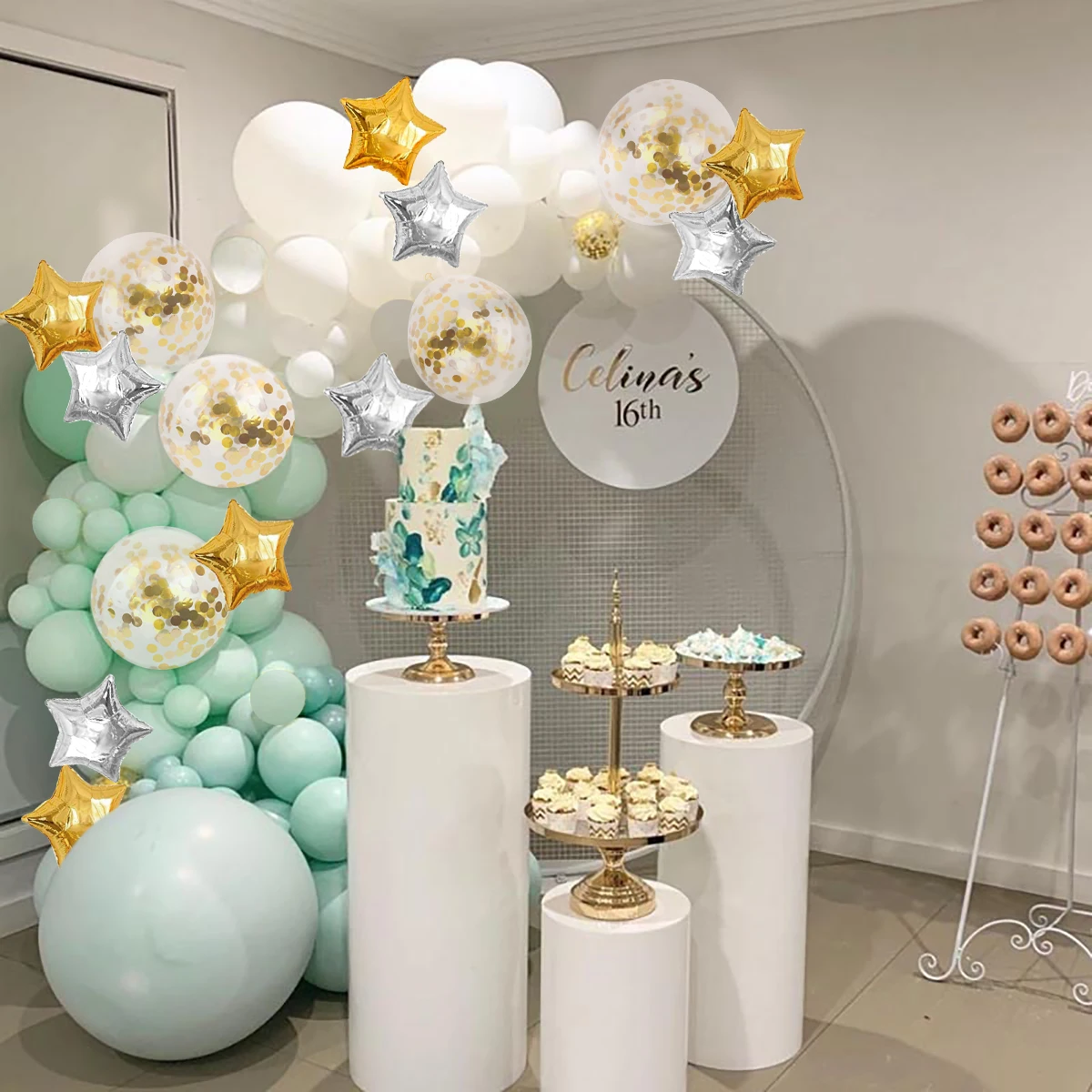 Зеленые серебряные макарон, металлические воздушные шары, гирлянда,...