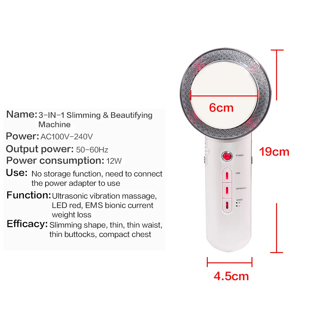 Выход: 15 в 800 мАЧастота звукового сигнала: 1 МГцВес: 205 гРазмеры: 6*19 см/2,36 * 7.48inПродукт включает в себя1 * Основная машина2 * пары EMS-прокладки1 * электродный шнур1 * адаптер1 * Руководство пользователя1 * коробкаОсобенностиХорошая производительность и потеря тепла части низкая.Эффективный ультразвуковой массажер для лица и тела.EMS лечение кожи и похудения. Инфракрасное устройство для термической терапии омоложения кожи.Улучшает текстуру кожи, против морщин, помогает бороться с жировыми участками, подтягивает.Быстро и эффективно уменьшает и избавляет от тяжелых хронических болей в спине, других видов боли в теле.Регулируйте внутреннюю секрецию и ускоряйте употребление жира, воплощайте мечты о похудении.Мини и стильный внешний вид, удобно носить с собой, прост в использовании.Для лица и телаСоветыТолько инфракрасная генерирующая часть будет нагреваться, ультразвуковая Массажная часть зонда без функции тепла.Если вы хотите регулировать секрецию и повышать потребление жира, вам нужно EMS.Если вы хотите массажировать свое тело, чтобы похудеть и ухаживать за кожей, вам нужно Sonic.Это важно для режима EMS, он перестанет работать автоматически через 10 минут, если вы хотите повторить, нужно включить его снова.Светильник в режиме EMS не включается, если нажимается звуковой режим. EMS обрабатывать липкими электродными прокладками. И нет режима, если настроить кнопку выбора режима на дно, нет интенсивности, если отрегулировать кнопку выбора интенсивности на дно.Упаковка включает:Без коробки:1 xmain машина1 штепсельная вилка (штепсельная Вилка eu/uk/us/au, мы отправим его согласно вашему выбору)2 шт. пачки EMS1 х электродный шнур1 х руководство на английском языкеС коробкой:1 xmain машина1 штепсельная вилка (штепсельная Вилка eu/uk/us/au, мы отправим его согласно вашему выбору)2 шт. пачки EMS1 х электродный шнур1 х руководство на английском языке1 x Подарочная коробка