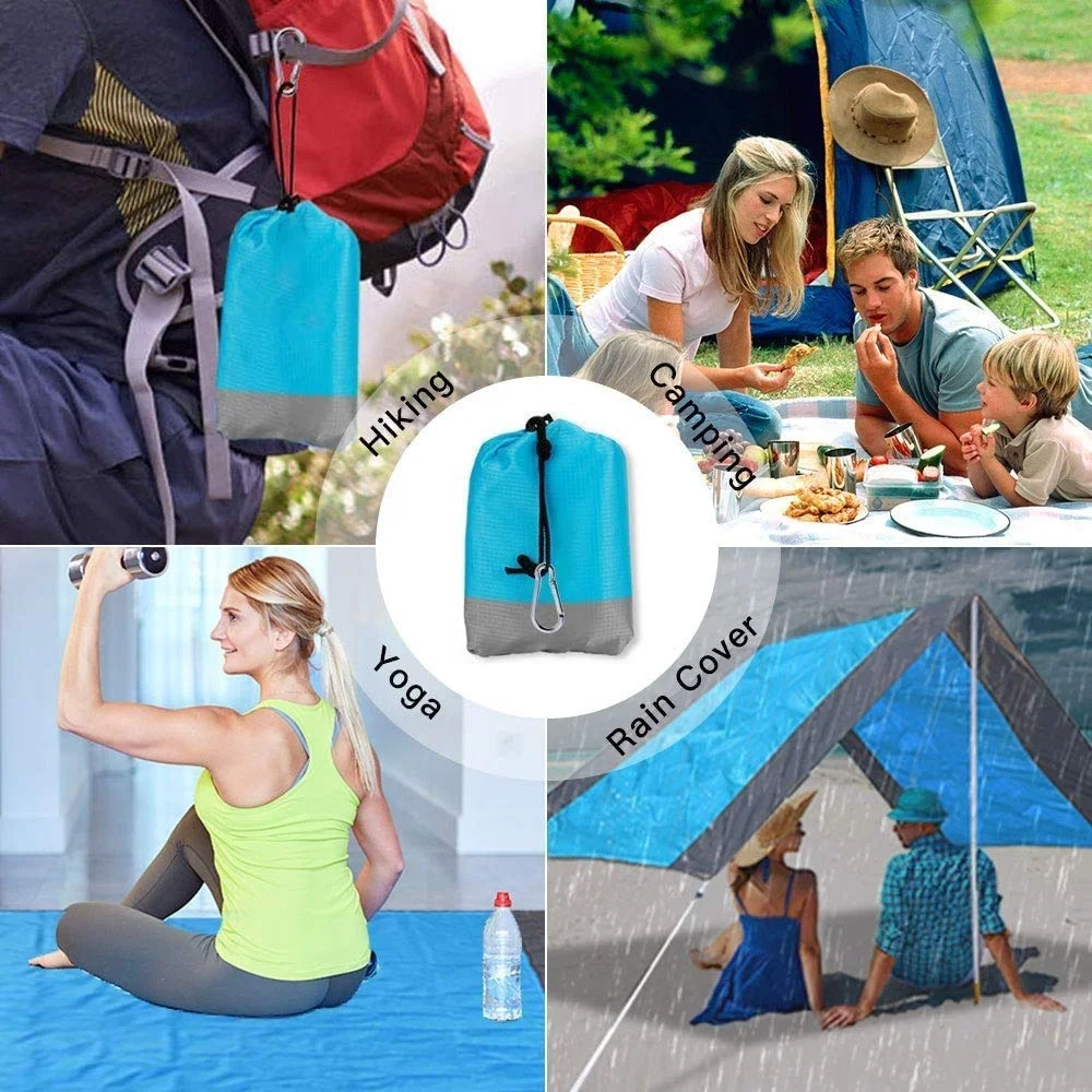 Особенности: Водонепроницаемый, во время дождя можно использовать его как плащ. Ветрозащитный, коврик с 4 колышками, не беспокойтесь о том, что его сдувают. Складной и портативный, вы можете сложить его и завязать на рюкзак. Легко моется, после использования положите его в стиральную машину, и он станет чистым Характеристики: Размер отверстия: 140*210 см 200*210 см Размер складывания: 16*7 см Материал: нейлон Содержимое упаковки: 1 коврик 1 x сумка для переноски 4 штифта
