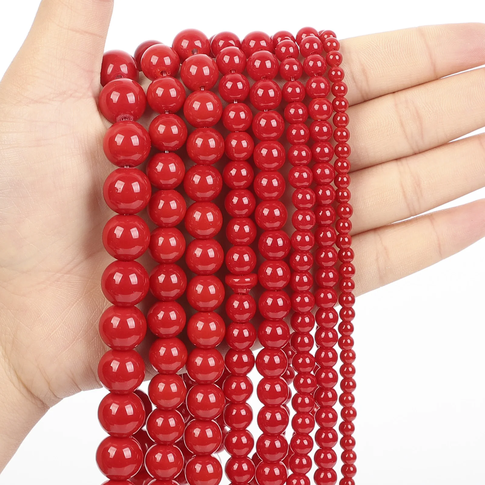 Бусины из натурального камня, коралловый красный стеклянный круглый бисер россыпью для изготовления ювелирных изделий, рукоделия, браслетов сделай сам 4-12 мм