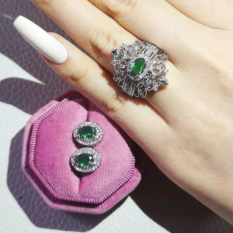 Комплект ювелирных изделий для невесты, круглые серьги-гвоздики с ореолом, обручальное кольцо, серебристого цвета, свадебный подарок, 2 шт.упаковка, J6248