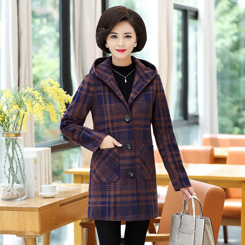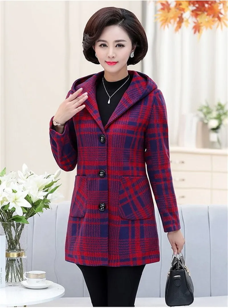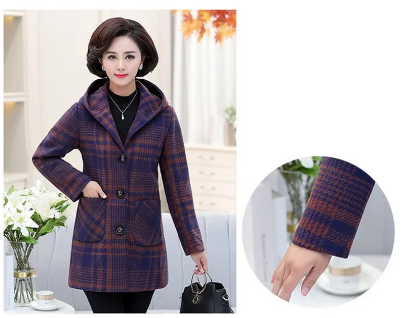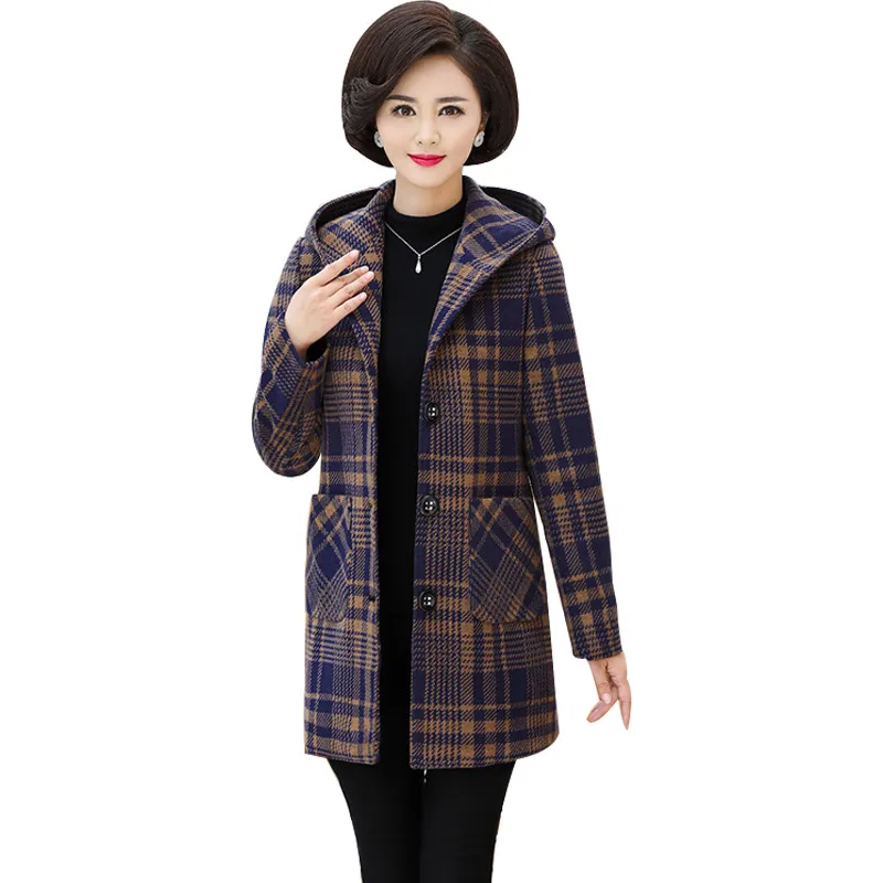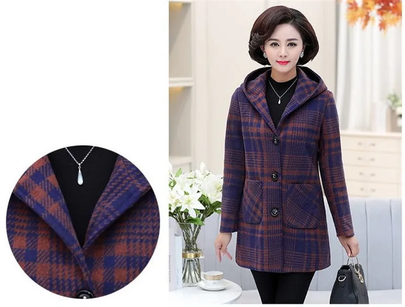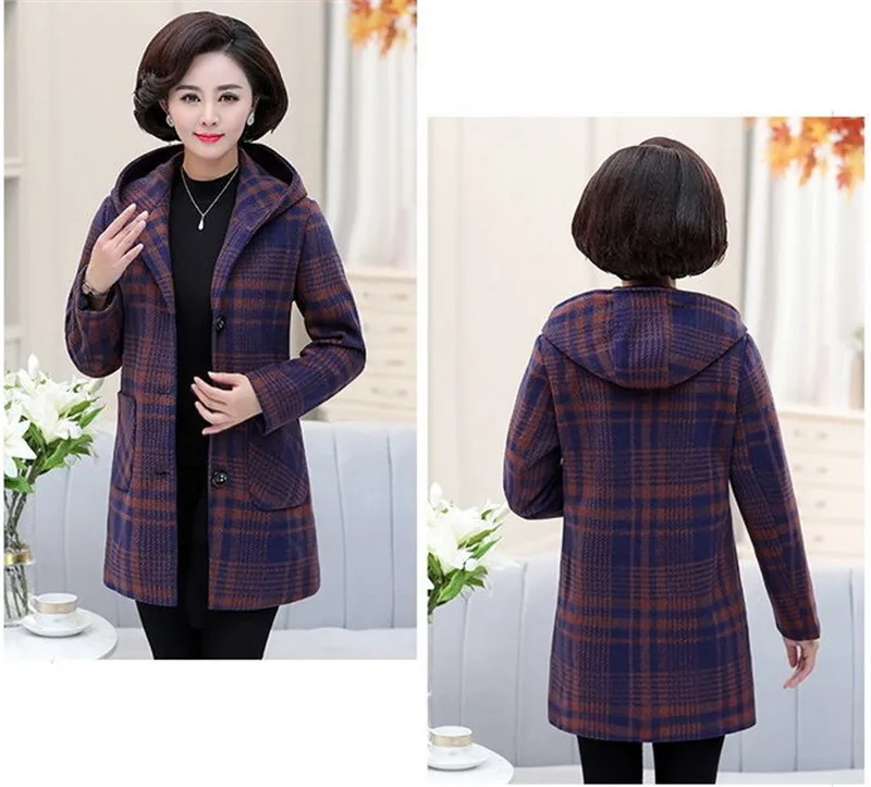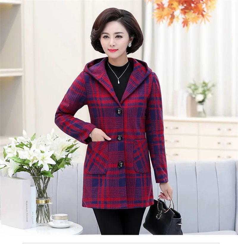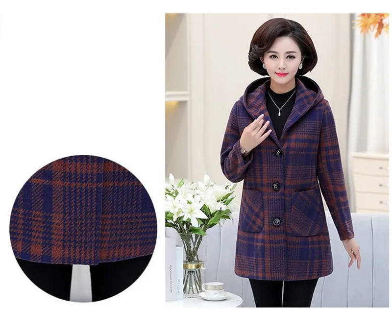 Осенняя женская обувь зимняя куртка, пальто, новая мода, в клетку, с капюшоном, верхняя одежда размера плюс 5XL для среднего возраста; Женские шерстяные пальто базовые Топы