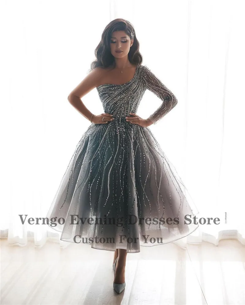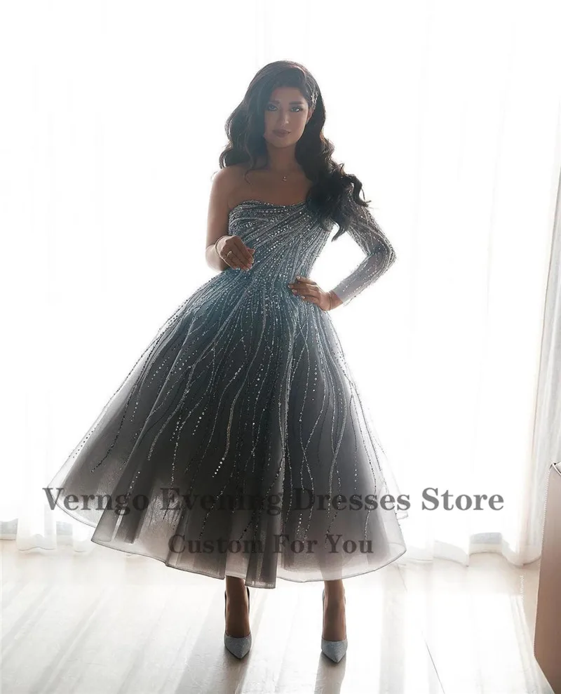Verngo блестящие короткие пыльно-СИНИЕ БУСИНЫ платье для выпускного с пайетками 2021 на одно плечо с длинным рукавом Дубай чай Длина Вечерние платья