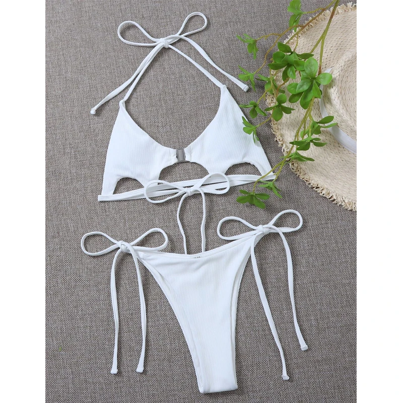 2021 сексуальный однотонный ребристый комплект бикини, купальник с вырезами, женский купальник с высокой бретелькой, пуш-ап, купальный костюм белого цвета