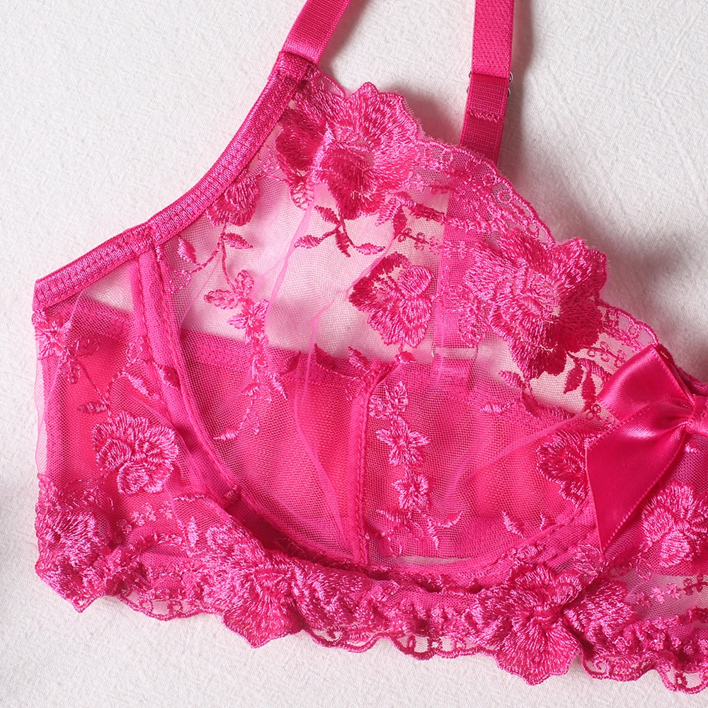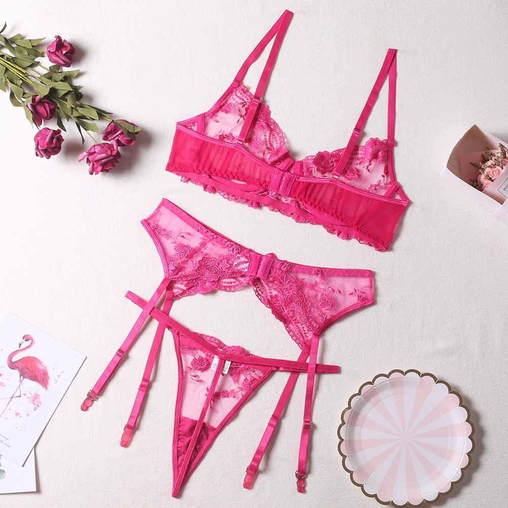 Комплект женского нижнего белья с цветочной вышивкой, бюстгальтер пуш-ап + подвязки + стринги, комплект из 3 предметов, прозрачное розовое нижнее белье