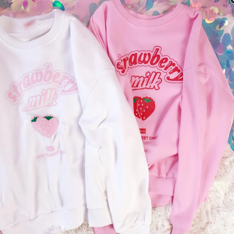 Толстовка Harajuku Kawaii с изображением клубники, молочного цвета, женская, винтажная, милая, розовая, повседневная, для девочек, топы, пуловеры
