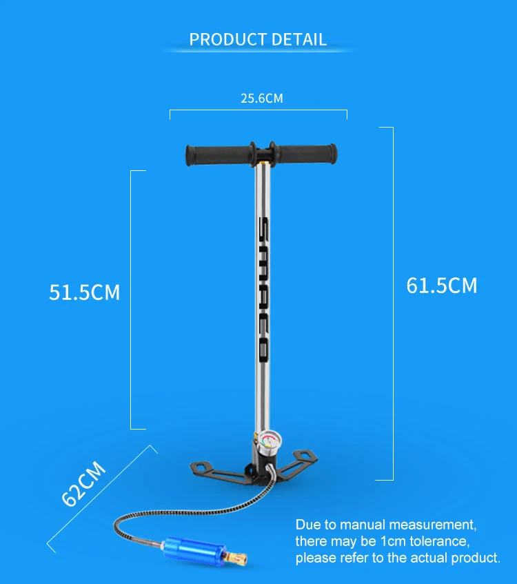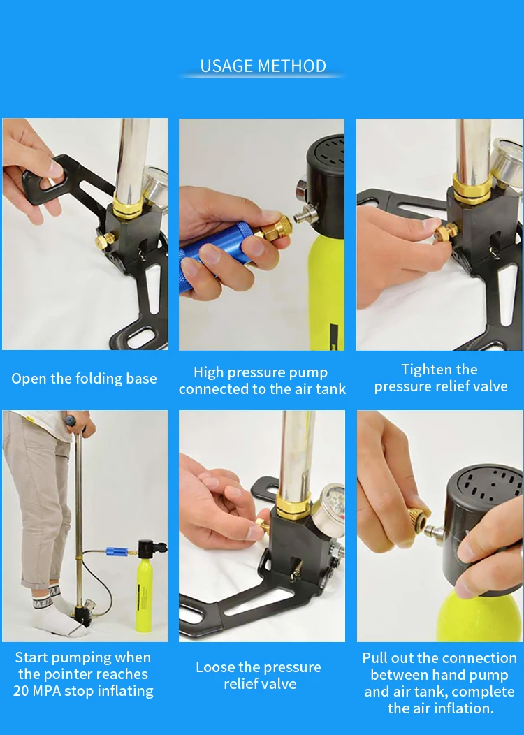 Посылка1 х насос1 х Руководство1 набор аксессуаровХарактеристики:Цвет: черныйМатериал: нержавеющая сталь + алюминийТип: ручной насосДавление воздуха: 30 мпаВысота: прибл. 63 см/24,81 дюймаОсобенности:-Нескользящая ручка для удобного использования.-Четырехступенчатая voltage-30MPA.-Складная Подножка для экономии места и удобства хранения.-Гибкий шланг с микроотверстиями для удобного наполнения.-С спускным клапаном для предотвращения попадания масла и воды в оборудование.-Подходит для всех кислородных баллонов SMACOПримечание:1. Проверьте винт выпускного клапана, убедитесь, что он плотно прилегает2. Используйте пол обеих ног, чтобы обеспечить стабильность работы насоса.3. Поместите газовый баллон на коврик (убедитесь, что шланг не загнут). Для начала быстро Потяните ручку вверх, а затем нажмите на нее, чтобы увеличить давление на газовый баллон. Когда ДАВЛЕНИЕ выше 10 МПа, накачать становится все сложнее. Это указывает на то, что давление нарастает.4. Из-за светильник и мониторах цвет изделияМожет немного отличаться от изображений. Пожалуйста, поймите.5. Возможны отклонения на 0,5-1 дюйм из-за использования вручную.