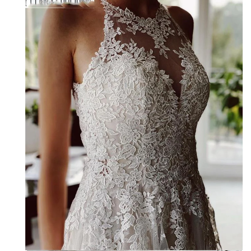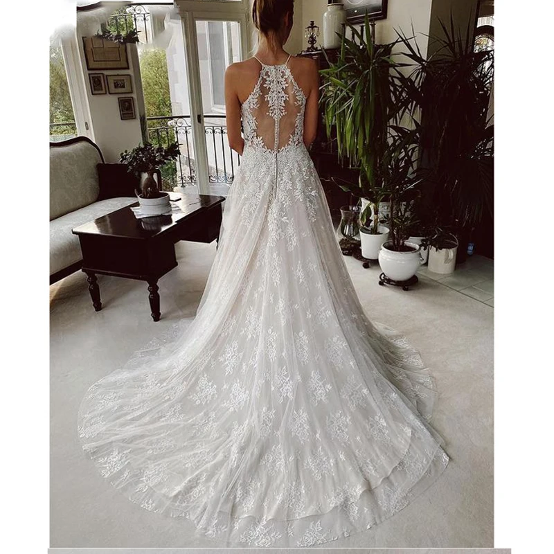 Женское кружевное свадебное платье, трапециевидного силуэта, с лямкой на шее, цвета слоновой кости, до пола, со шлейфом, без рукавов, размера плюс