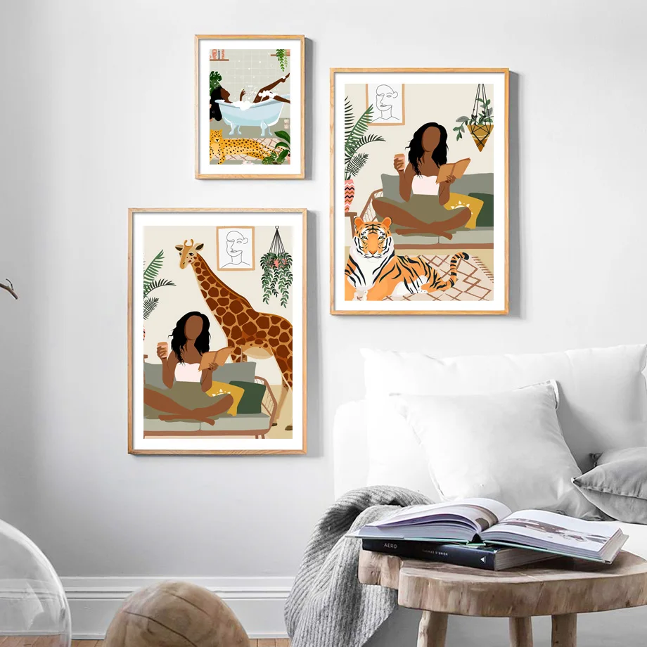 Бохо абстрактная девушка Жираф тигр леопард лев настенный художественный Принт Холст Картина скандинавский плакат Настенные картины для декора гостиной