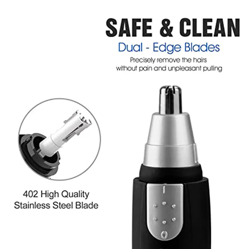 Характеристики: Материал: металл и пластик Размер: 30*130 мм Цвет: черный или серебристый Особенности: Трехмерный сегмент арки, не повреждает полость носа. Предназначен для отделки ушей и волос в носу. Вращение на 360 градусов, может захватывать длинный нос в любом направлении. Водонепроницаемая конструкция, влажная или сухая чистка и санитарная. Изогнутое, гипоаллергенное лезвие из нержавеющей стали. Подходит как для мужчин, так и для женщин. Описание: Прозрачная крышка для защиты лезвия, длительный срок службы Резиновый скользящий переключатель вкл/выкл, удобный и безопасный. Небольшой и легкий дизайн, отлично подходит для путешествий.