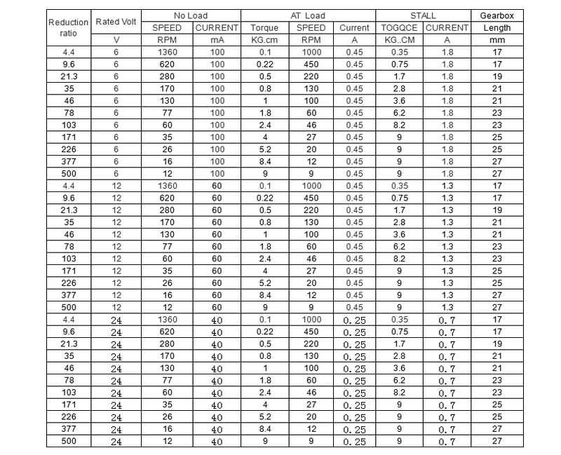 Скорость без нагрузки:12 об/мин, 16 об/мин, 26 об/мин, 35 об/мин, 60 об/мин, 77 об/мин, 130 об/мин, 170 об/мин, 280 об/мин, 620 об/мин, 1360 об/мин
