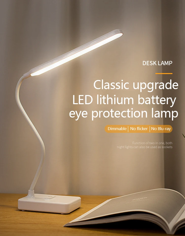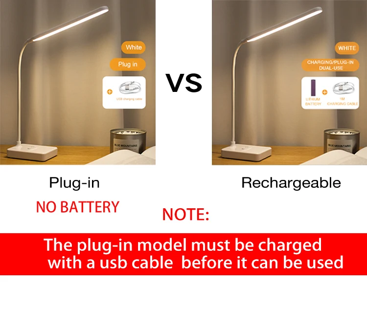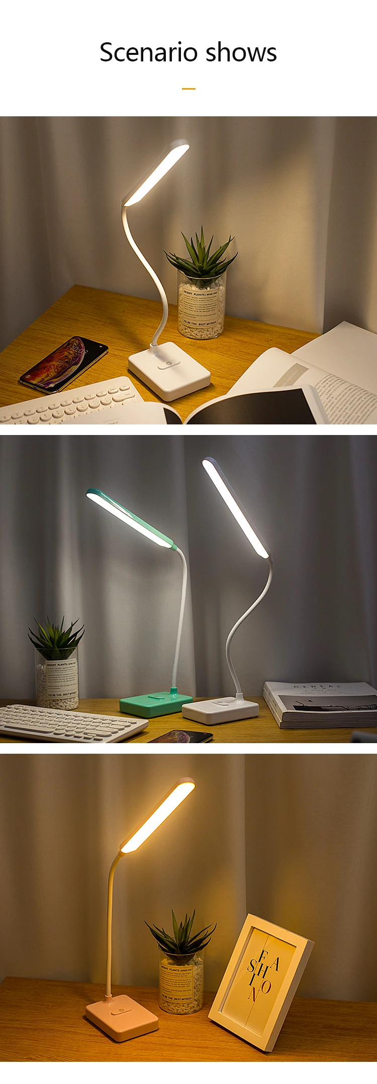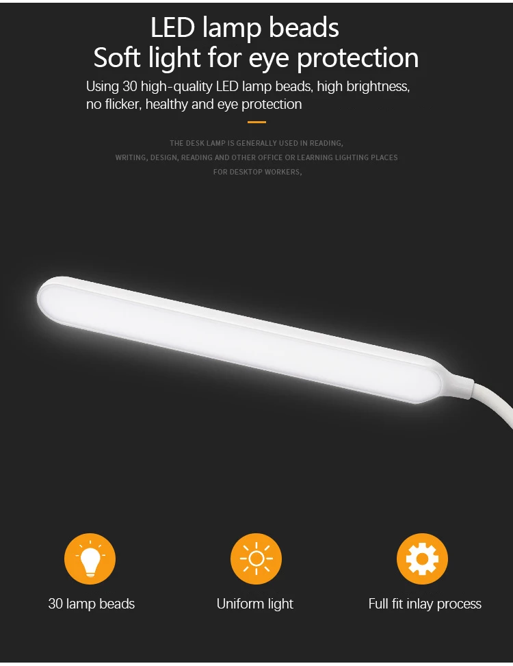 Подсказка:Пожалуйста, используйте мобильный телефон зарядное устройство или внешний аккумулятор с выходным напряжением 5 В и выходным током 1 А. Если выходной ток слишком большой или используется неправильное стандартное зарядное устройство 1A, это вызовет недостаточную яркость и повредит лампу.Новая перезаряжаемая настольная лампа для защиты глазСпецификация:Цветовая температура продукта: 3000-6000KСветильник яркость: свободная регулировкаМетод управления: трехуровневый сенсорный затемняющий белый светильник, теплый естественный светильникСпецификация батареи: литиевая батарея 18650 3,7 v 1500mAНоминальная мощность: 2,5 WКол-во светодиодный свет: 30 шт. 5730 SMD лампы бусиныСветильник источник света: светодиодныйМатериал тени: пластикРежим переключения: сенсорныйСтиль: Современный и простойРежим питания: Встроенный литиевый аккумуляторПодключаемая Модель: необходимо всегда использовать usb для зарядки, без аккумулятораОсобенности:1. Цветовая температура длительной работы или места чтения и письма не должна превышать 4000K.2. Долго нажимайте плавное затемнение, чтобы выбрать наиболее комфортный светильник для глаз.3. Цвета объектов в области освещения становятся все более и более четкими, и человеческий взгляд выглядит комфортно и естественно.4. Зарядка и подключение двойного назначения, узнайте во время зарядки.