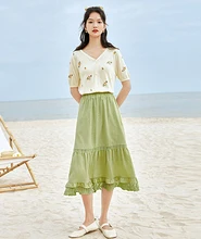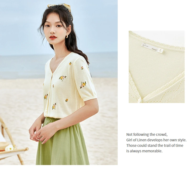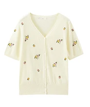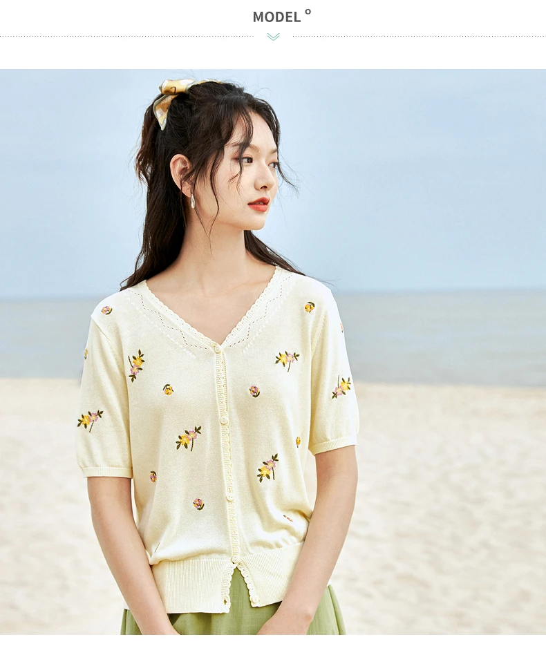 Женский тонкий пуловер с V-образным вырезом, коротким рукавом и цветочной вышивкой, летние трикотажные изделия