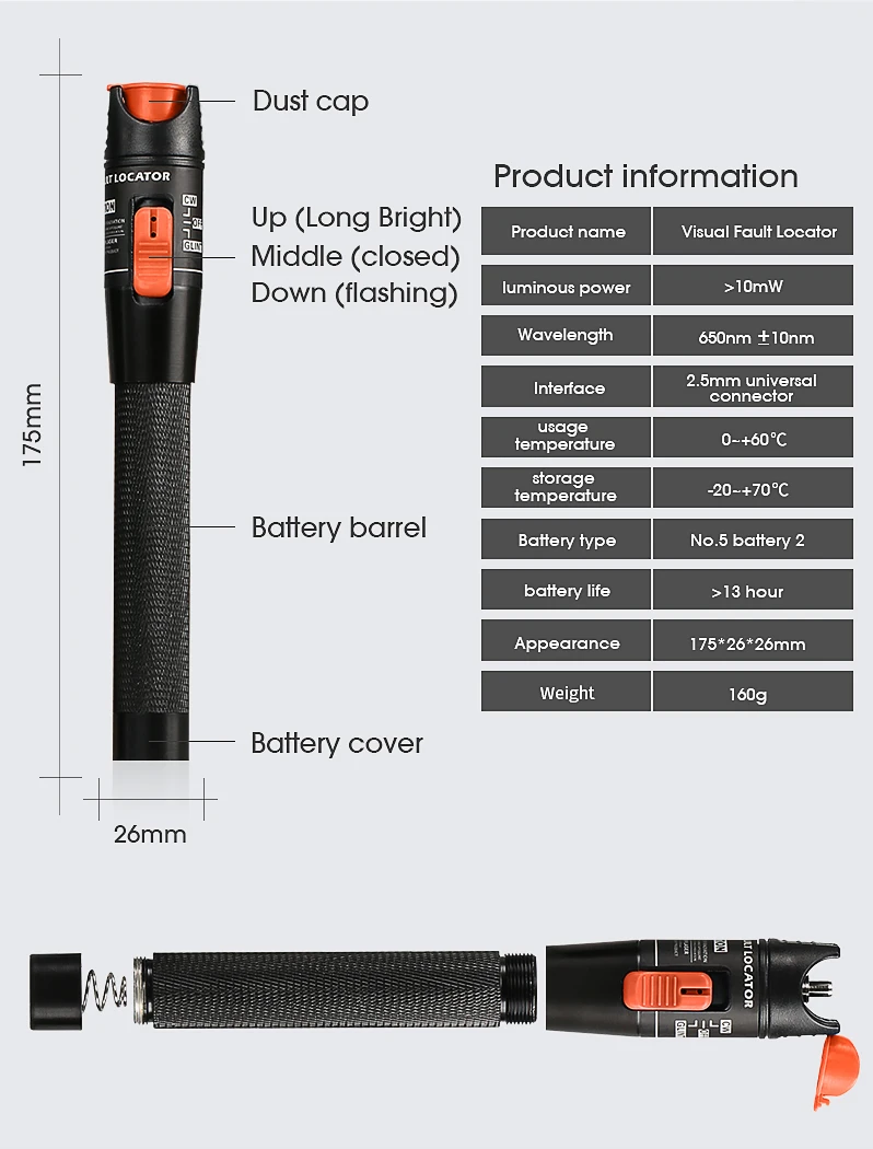 1. [практичный дизайн и отличная функция】небольшой размер и легкий, портативный и простой для полевых испытаний с множеством функций, таких как постоянная выходная мощность, Низкое предупреждение о заряде батареи, длительный срок службы батареи и обнаружение на большом расстоянии.2. [легкая и точная идентификация] он может легко и точно обнаруживать и обнаруживать разрывы волокон, плохие соединения, изгибы или растрескивания. Детектор будет излучать 650 нм ярсветильник для отслеживания волокон, разрывов или неисправностей волокна будет преломлять светильник.3. [Длительная выходная мощность] Этот Визуальный дефектоскоп мощностью 30 МВт с мощным красным светильник катором мощности батареи проходит на расстояние 20-30 километров, высокоэффективные цепи питания обеспечивают стабильную мощность.4. [легкая и точная идентификация] он может легко и точно обнаруживать и обнаруживать разрывы волокон, плохие соединения, изгибы или растрескивания. Детектор будет излучать 650 нм ярсветильник для отслеживания волокон, разрывов или неисправностей волокна будет преломлять светильник.5. [портативный] дизайн в виде ручки с чехлом делает его портативным, легко проверить ошибки волокна с визуальным локатором неисправностей, прочный, пыленепроницаемый дизайн сохраняет волоконные разъемы в чистоте