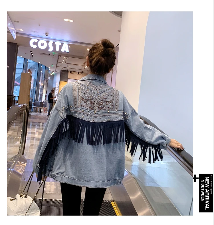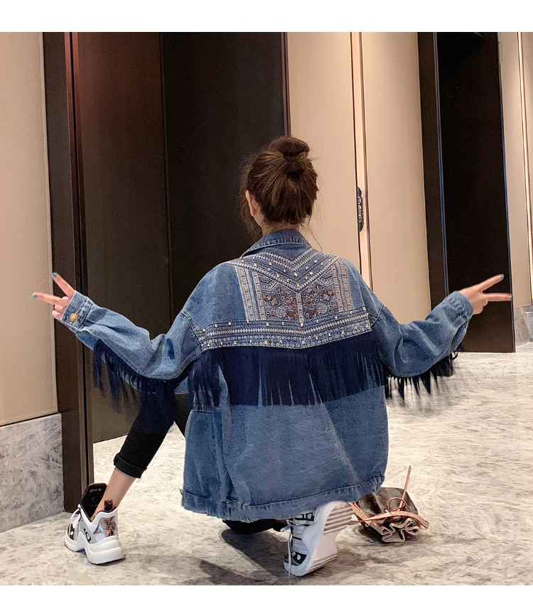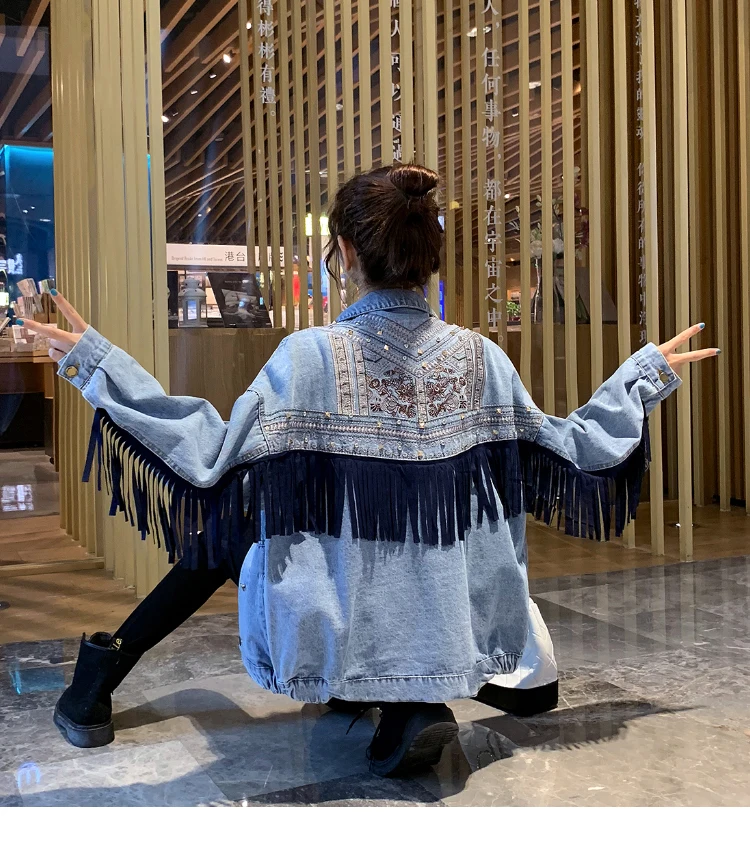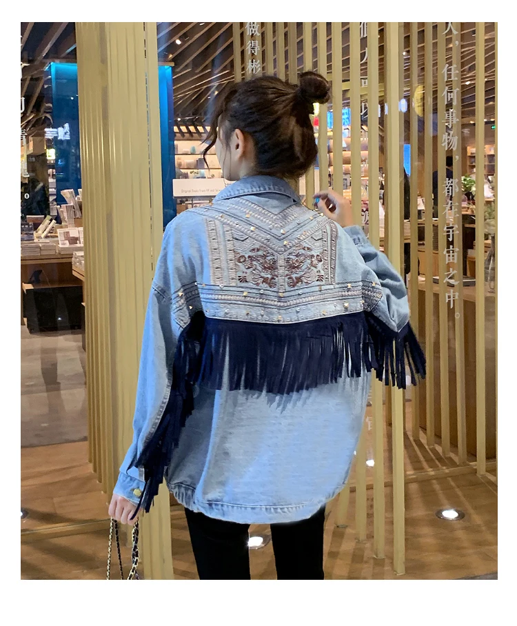 Джинсовая куртка с цветочной вышивкой, замшевое Свободное пальто с бахромой, верхняя одежда с длинным рукавом, уличная одежда, куртка с заклепками со стразами, Женская куртка