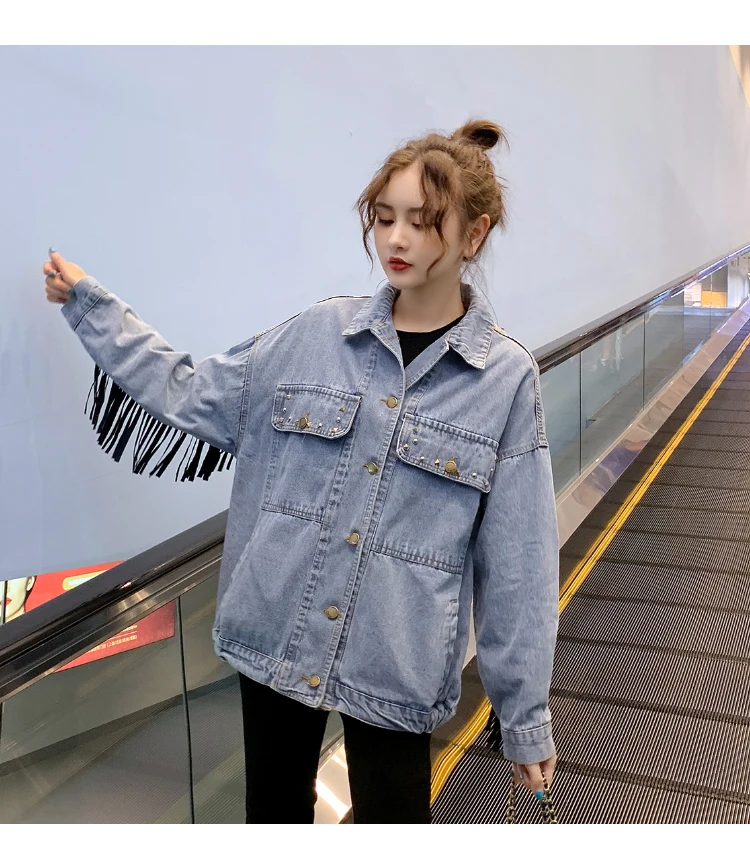Женская джинсовая куртка ручной работы, с заклепками, кисточками и ...