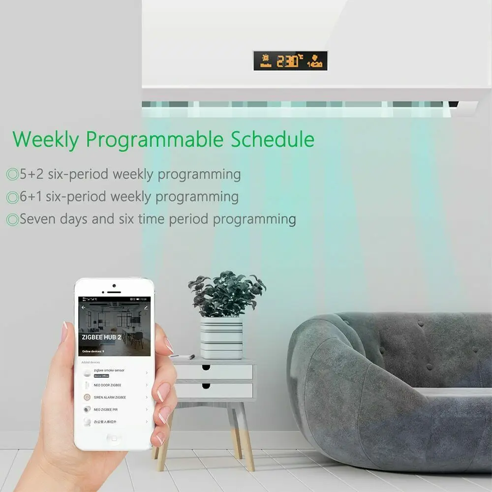 3. Программируемое расписание с выбором еженедельного программирования: поддерживает ручную настройку 5 + 2,6 + 1 и 7 дней в неделю с 6 периодами на выбор, обеспечивает максимальное удобство в различных ситуациях и устанавливает Индивидуальный график для температуры вашего дома. Доступен праздничный режим, автоматический режим, режим повышения. Выберите режим «рабочий день» и «день восстановления» для удовлетворения ваших потребностей.