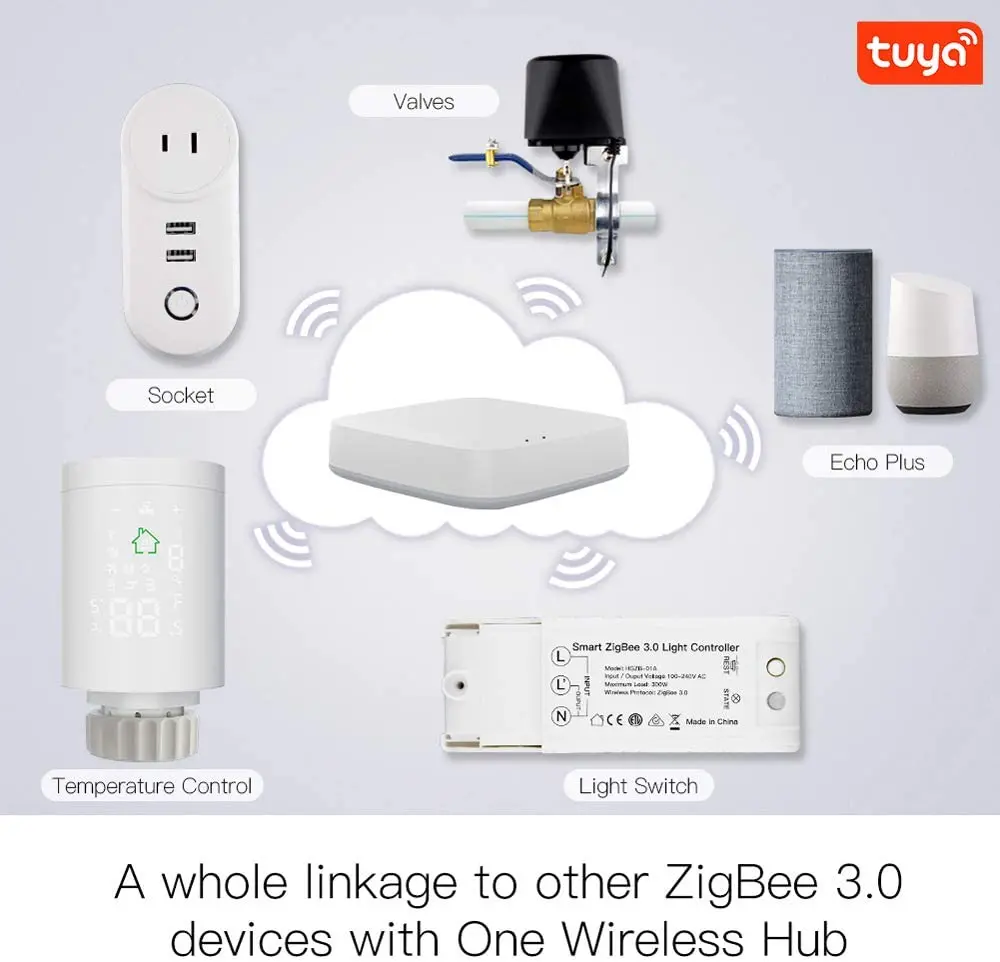 2. Беспроводной шлюз Tuya ZigBee-это обязательный элемент: беспроводной концентратор ZigBee-это обязательный элемент, который подключается к клапану многих других умных продуктов ZigBee и реализует всю связь ваших устройств умного дома. Просто добавьте свой шлюз в приложение, а затем добавьте привод радиатора к своему шлюзу в приложении.