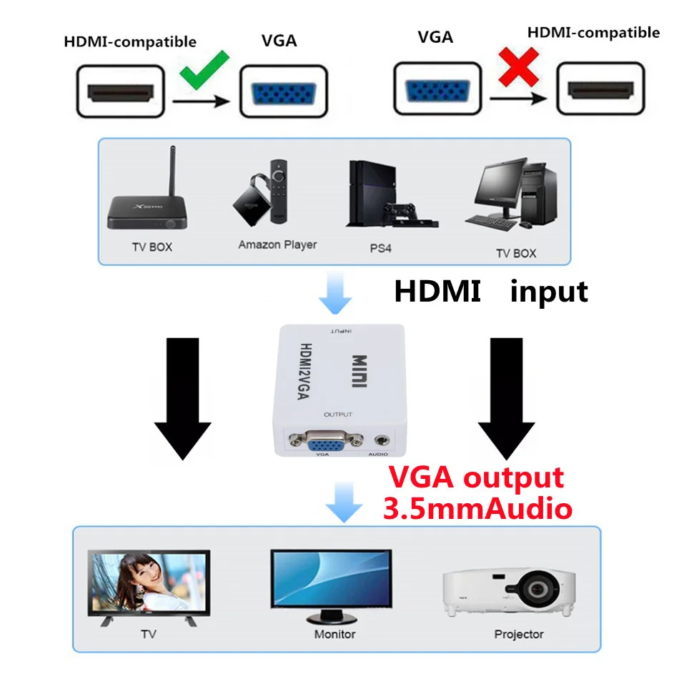 Стенд: Прямая поставка, розничная торговля, оптовая продажа Свяжитесь со службой поддержки клиентов Хорошее обслуживание хорошее качество HD 1080P HDMI совместимый VGA адаптер конвертер HDMI совместимый VGA конвертер, ноутбук с аудио, для HDTV проектора Введение: HDMI-совместимый конвертер-это видео конвертер высокой четкости, который может преобразовывать цифровые сигналы, совместимые с HDMI, в аналоговые сигналы VGA и аналоговые аудиосигналы. HDMI совместимый сигнал подключения используется для PS3 для XBOX360, Blu-Ray DVD, HD телеприставка, CRT/светодиодный дисплей и т. Д. Вы можете легко смотреть видео высокой четкости на обычных телевизорах, у которых нет совместимых интерфейсов HDMI. Особенности: 1. Нет необходимости устанавливать драйверы, портативный, гибкий, подключи и работай 2. Низкое энергопотребление, не требуется источник питания 3. Синхронизация выходного аудио и видео 4. Высокая пропускная способность поддерживает 1920x1080 @ 60 Гц Спецификация: 1. Входной порт: гнездовой разъем, совместимый с HDMI 2. Выход порт: VGA Женский и 3,5 мм jack 3. Размеры (мм): 66(D)x55(W)x20(H) 4. Цвет: белый Посылка включает в себя: 1 х HDMI совместимый 2 VGA конвертер 1 х USB шнур питания