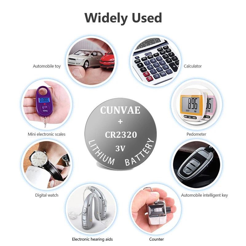Тип батареи: батарея CR2320 3V литиевая батарея BR2320 Бренд: CUNVAE Химия: батарея LiMnO2 Номинальное напряжение: 3 в Критическое напряжение: 2,0 V Нормальная емкость: 130 мАч Непрерывный ток: 3 мА (максимум) Импульсный ток: 20 мА (максимум) Максимальный размер: 23x2,0 мм Температура: от-40 до + 60 градусов Цельсия Также может быть известен как: CR2320, DL2320, ECR2320, BR2320, 280-208, DL2320B, KCR2320, LM2320 Применение: часы, часы, калькуляторы, компьютеры, камеры, цифровые камеры, КПК, пульты дистанционного управления, видеокамеры, электронные игры, электронные инструменты, MP3-плееры, цифровые диктофоны, игрушки, глюкозы в крови, измеритель уровня холестерина и другие электронные продукты.