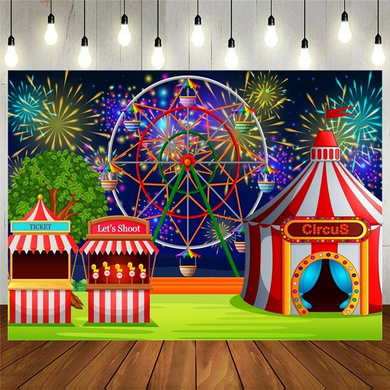 Фон для детской фотосъемки с изображением ярмарки цирка, мультяшного парка развлечений, колеса обозрения, фейерверка