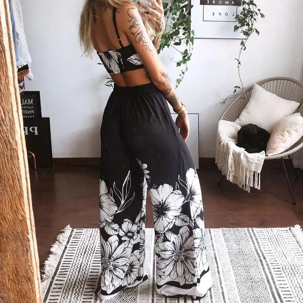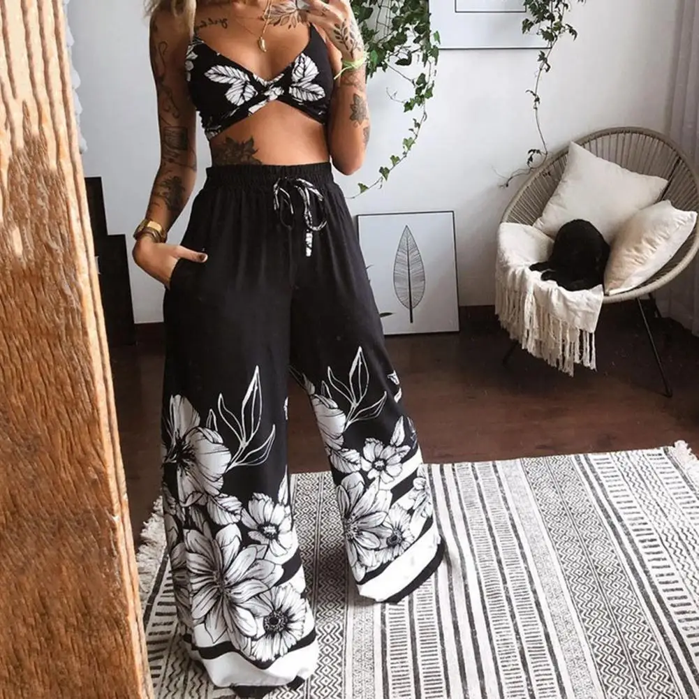 Из 2 предметов, костюм Летний тренировочный костюм Комплекты Женские костюмы Бохо пляжные Стиль принт нижнее бельё для девочек, свободные, широкие в ноге, штаны Женская одежда костюм; Новинка