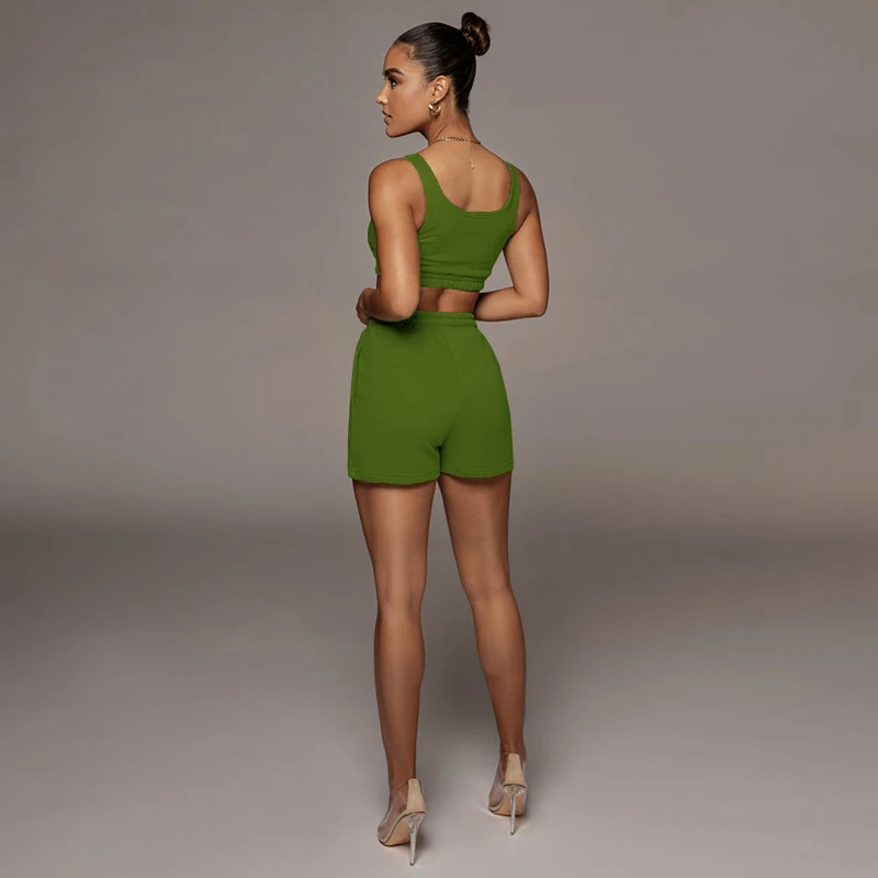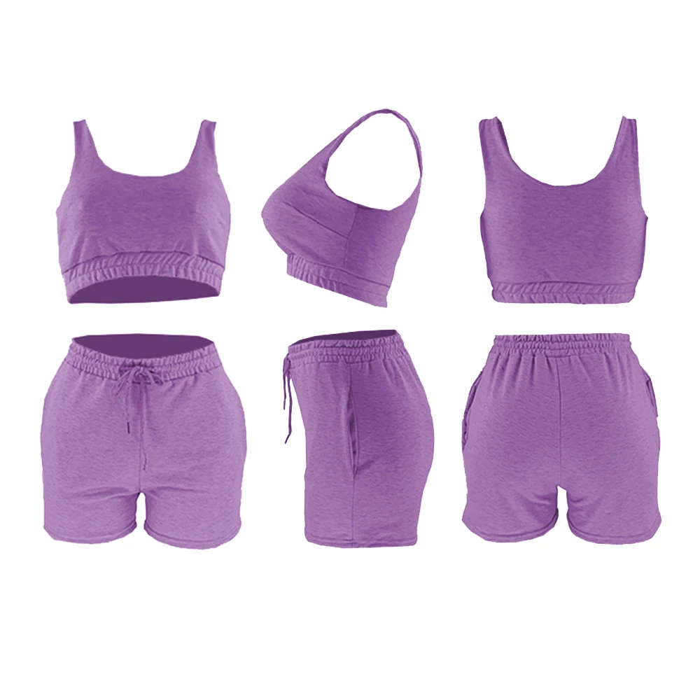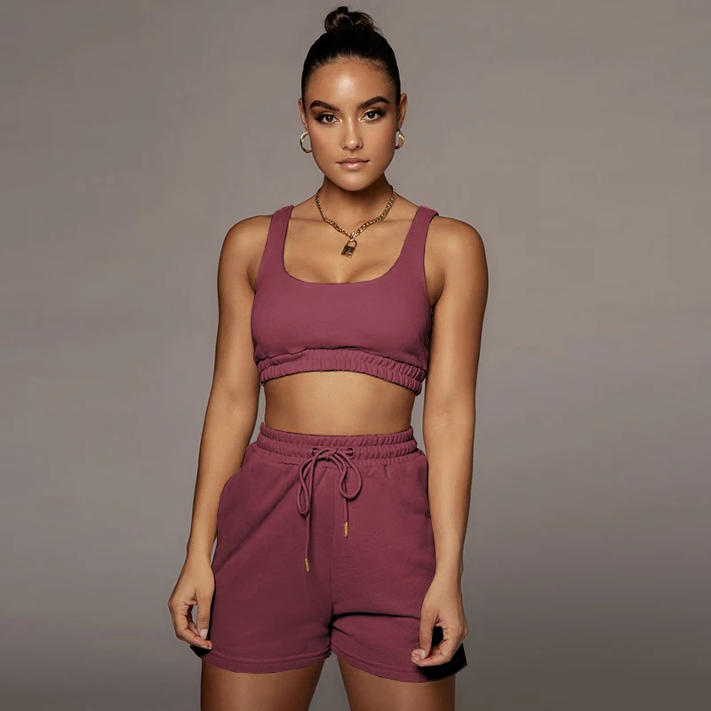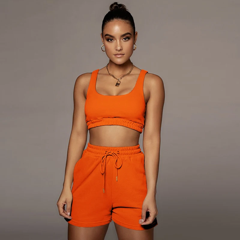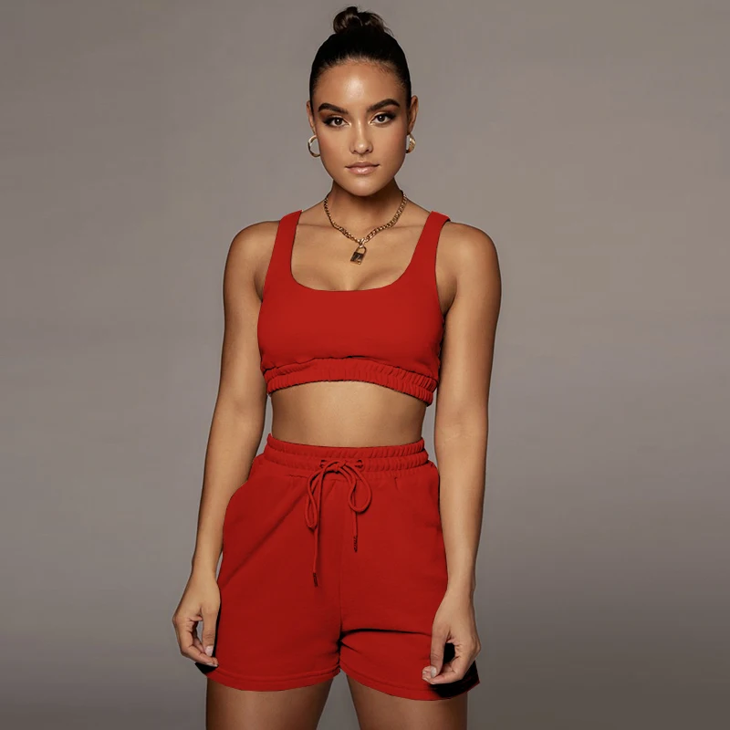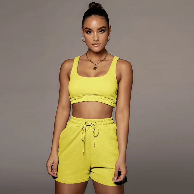Женский Повседневный однотонный спортивный костюм, комплект из двух предметов, короткий топ и шорты на завязках, летняя спортивная одежда для отдыха, 2021