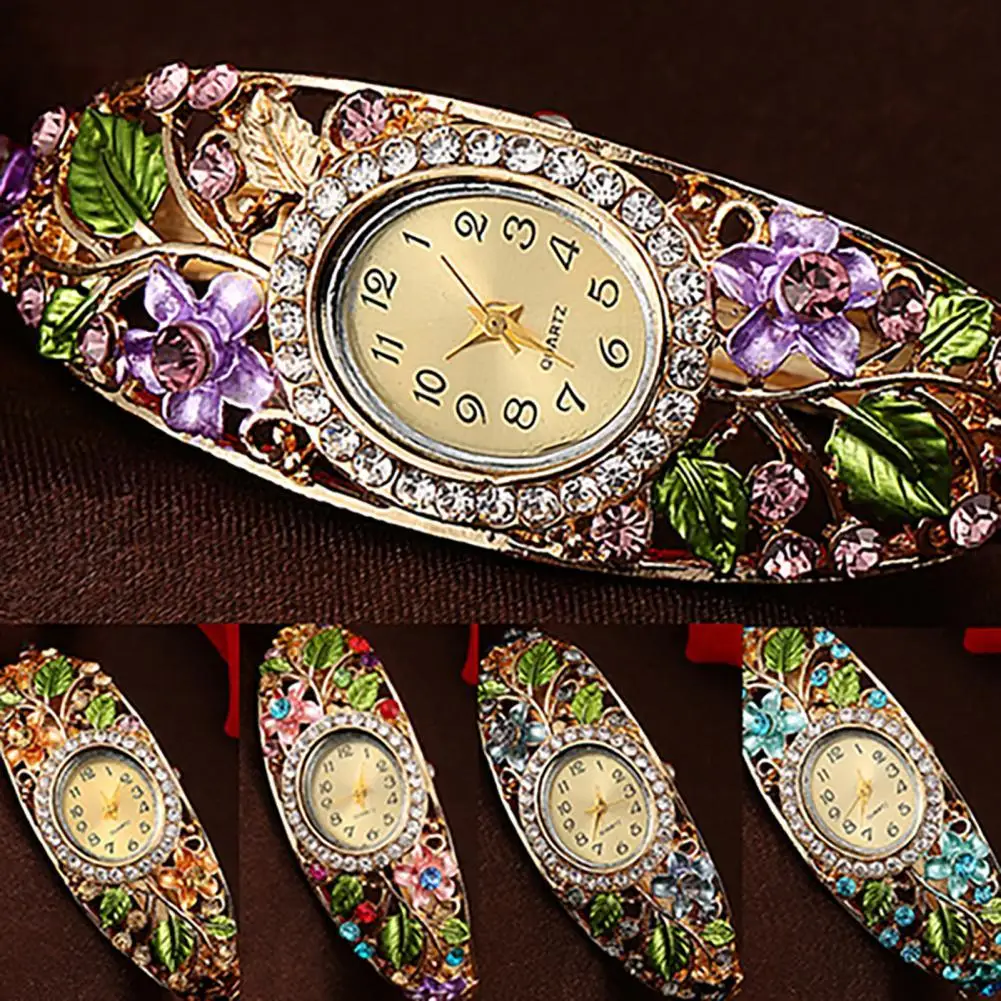 Особенности: Женские женские наручные часы с позолотой и кристаллами из цветного сплава жесткий браслет с цветком аналоговые кварцевые. Блестящие прозрачные стразы чехол плюс красивый цветочный сплав браслет часы ремешок, красивые повседневные наручные часы. Хороший подарок для ваших друзей, сестер и семьи.