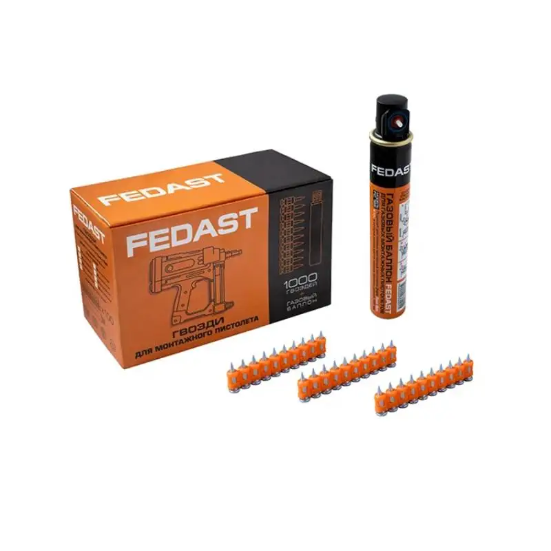 Гвозди по бетону FEDASTсовместимы с монтажными пистолетами производства HYBEST, SPIT Pulsa, Aiken, MAX, Ramset, Makita, HITACHI, Trusty, Toua, Beaи других производителей.Гвозди поставляются в комплекте с газовым баллоном FEDAST 165 мм, совместимым с большинством производителей газовых монтажных пистолетов.